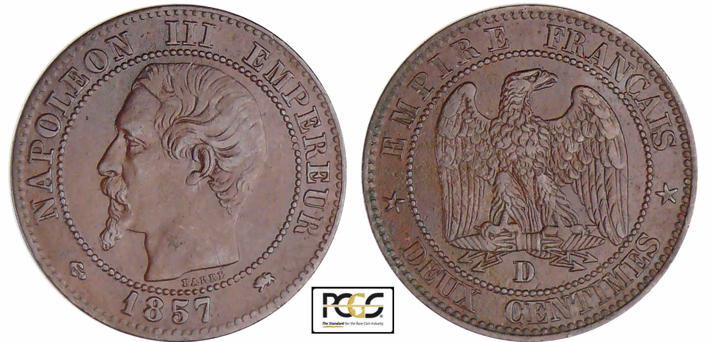 / Napoléon III (1852-1870) – 2 centimes tête nue 1857 D (Lyon) grand D – petit lion