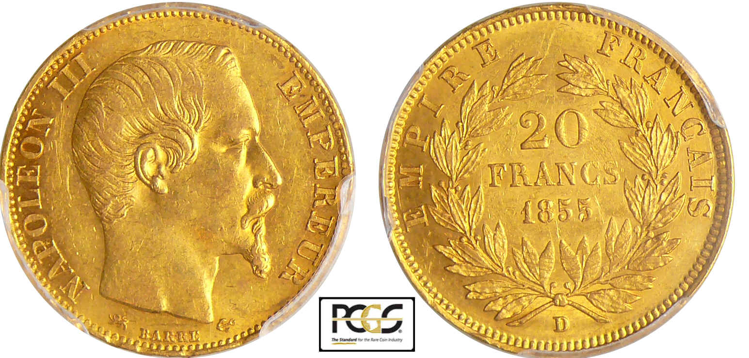 / Napoléon III (1852-1870) – 20 francs tête nue 1855 D (Lyon) petit lion