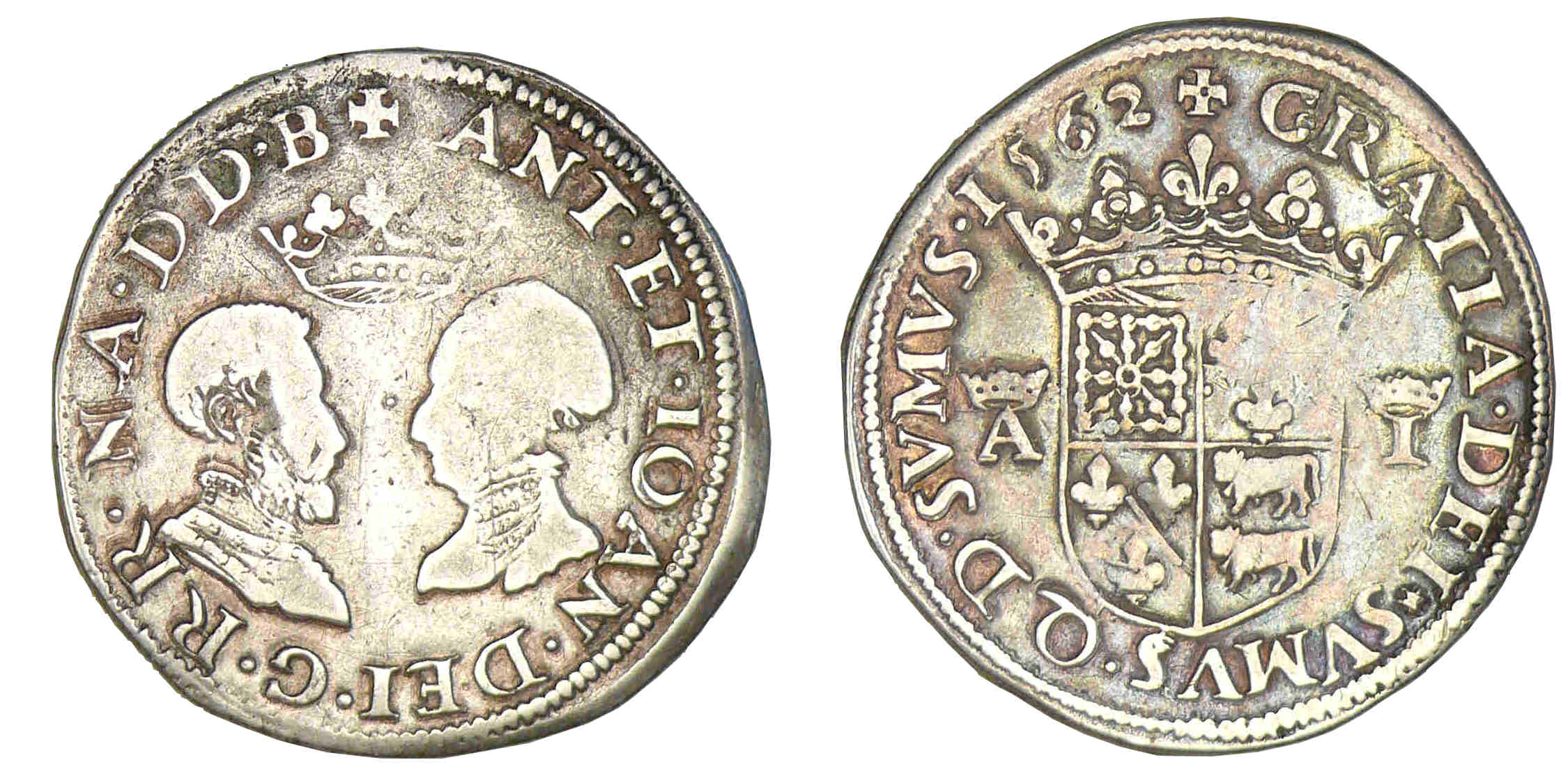 Avers : Antoine de Bourbon et Jeanne d’Albret (1555-1562). A/ + ANT ET IOAN DEI G RR NA D D B. Bustes affrontés et habillés d’Antoine et Jeanne sous une couronne.
