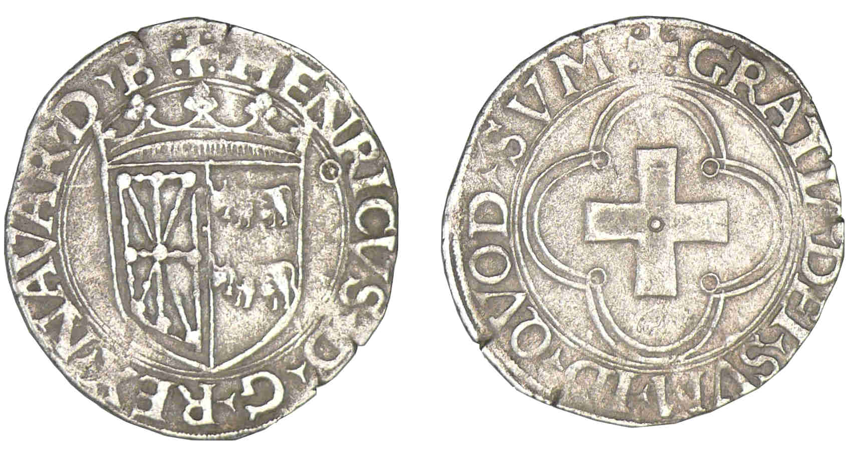 Henri d’Albret (1516-1555). A/ :+: HENRICVS* D* G* REX* NAVAR* D* B. Ecu couronné mi-parti, au 1 de Navarre et au 2 de Béarn.