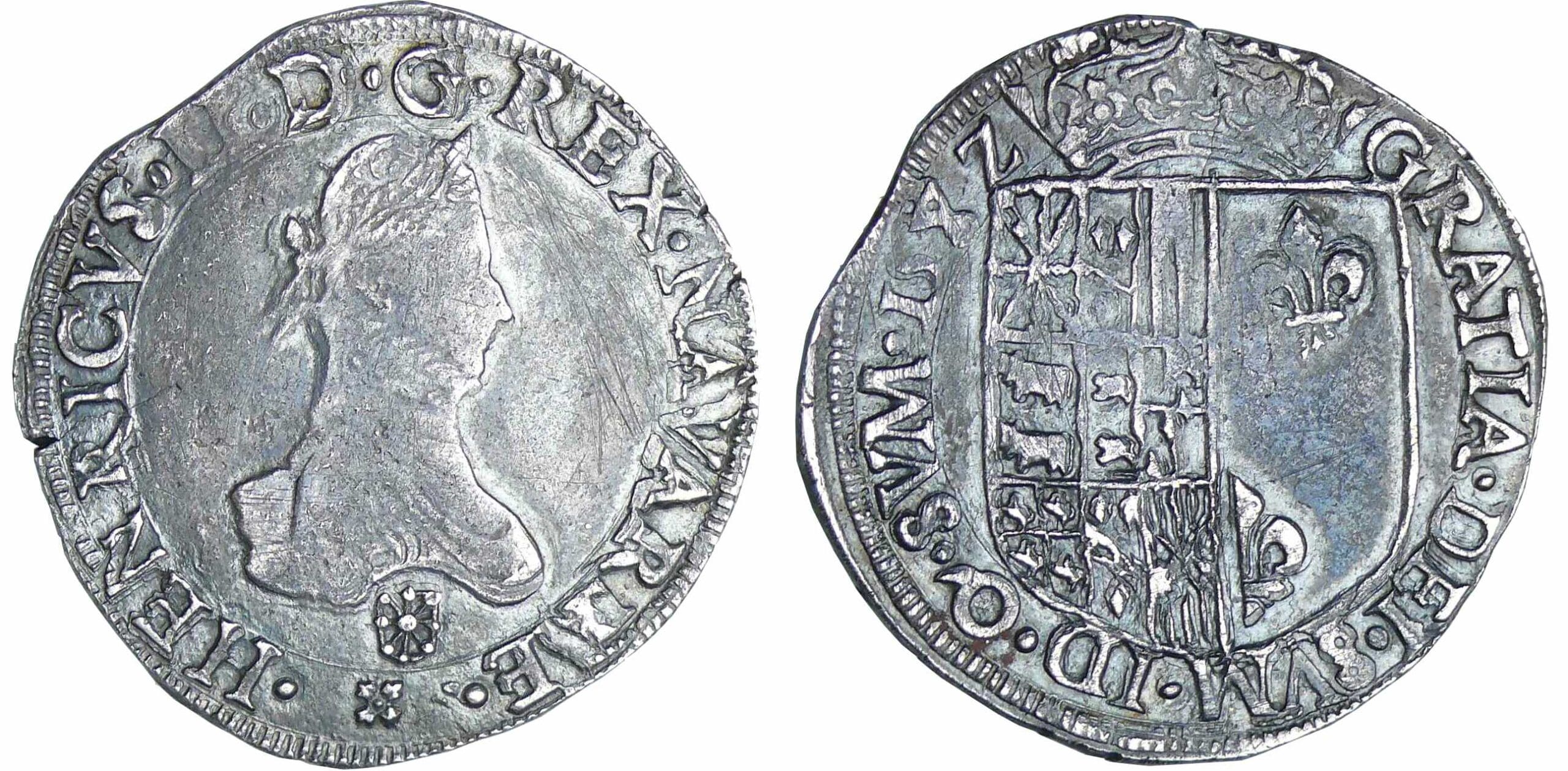 Avers : Henri III de Navarre, II de Béarn Franc (1572-1589). A/ (quatrefeuille) – .HENRICVS. II. D. G. REX. NAVARRE. Grand buste de Henri III de Navarre à droite. Sous le buste, un petit écu de Navarre.