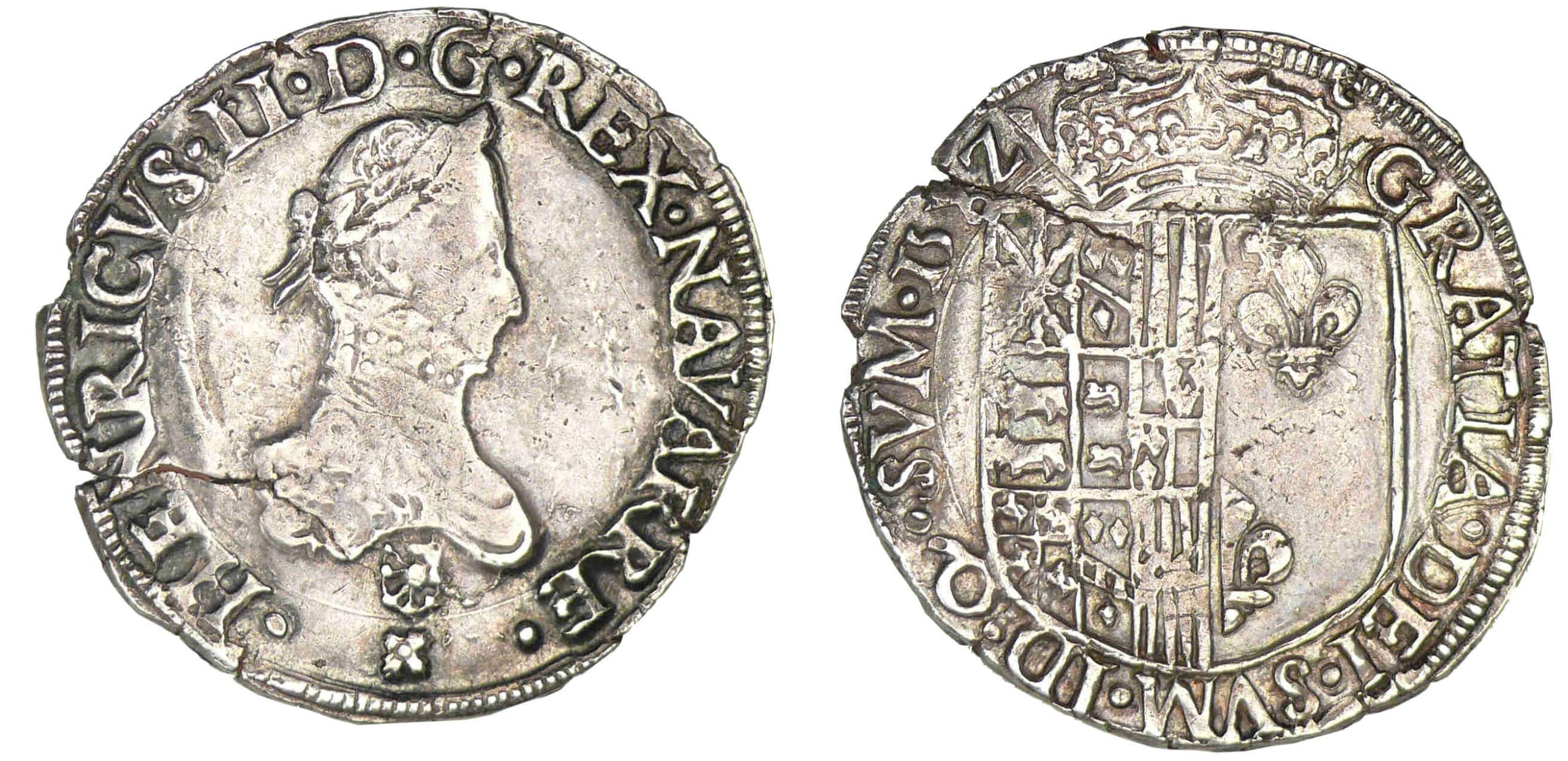 Avers : Henri III de Navarre, II de Béarn Franc (1572-1589) A/ (quatrefeuille) – .HENRICVS. II. D. G. REX. NAVARE. Petit buste de Henri III de Navarre lauré et cuirassé à droite sous le buste un petit écu de Navarre.