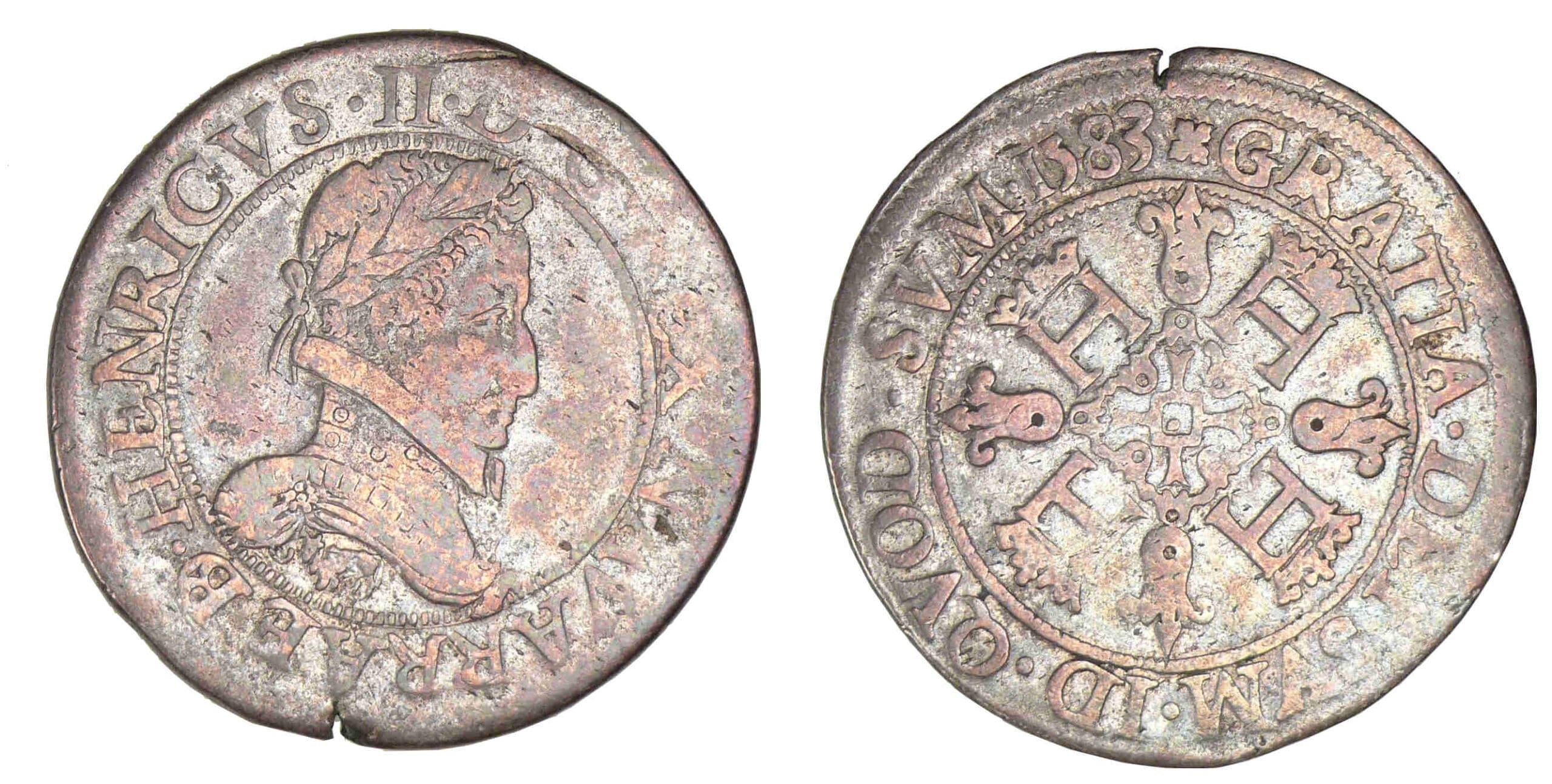 Revers : R/ (fleuron) GRATIA. DEI. SVM. ID. QVD. SVM. (millésime) Croix formée de quatre fleurons et cantonnée de quatre H couronnés.