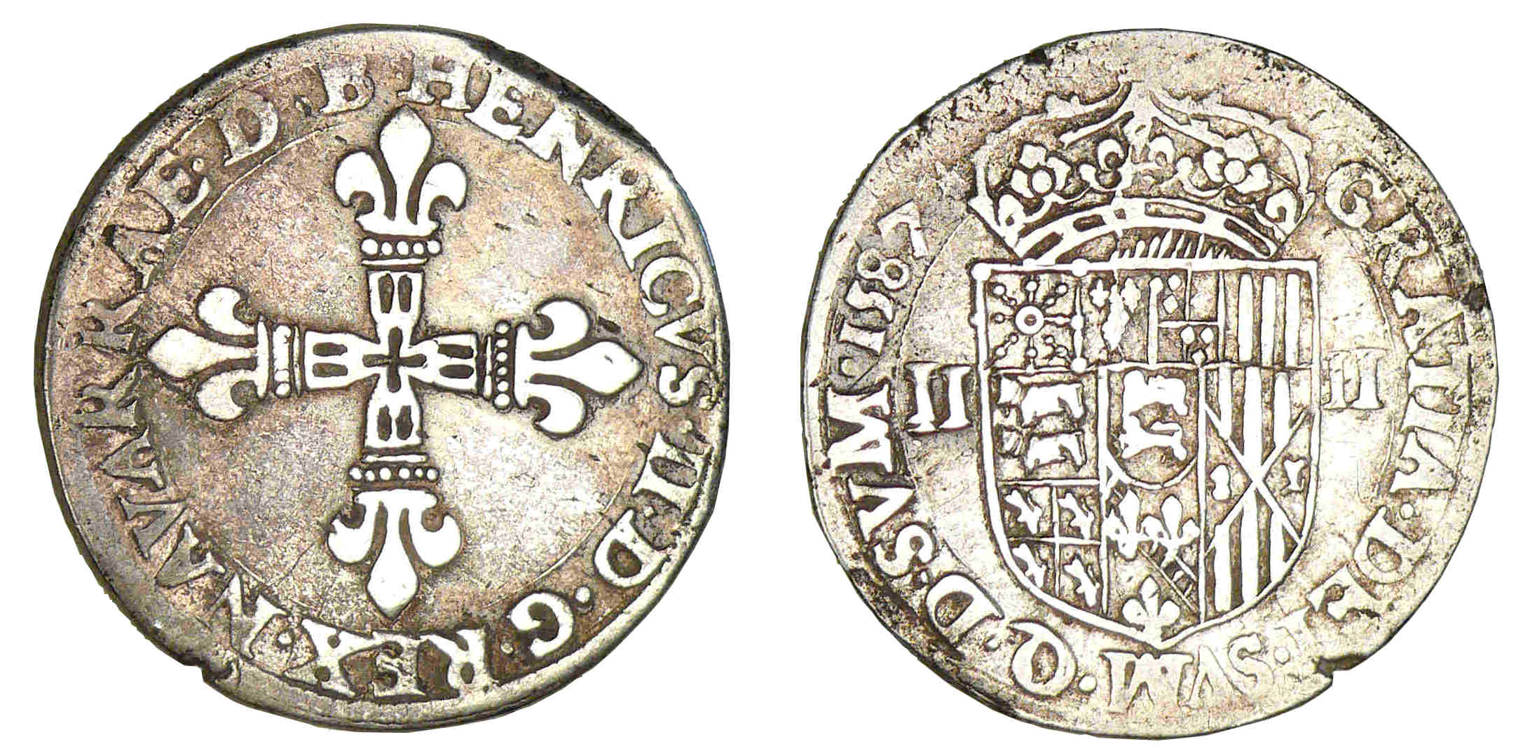 Avers : Henri III de Navarre, II de Béarn Franc (1572-1589). A/ .HENRICVS. II. D. G. REX. NAVARRAE. Croix fleurdelisée.
