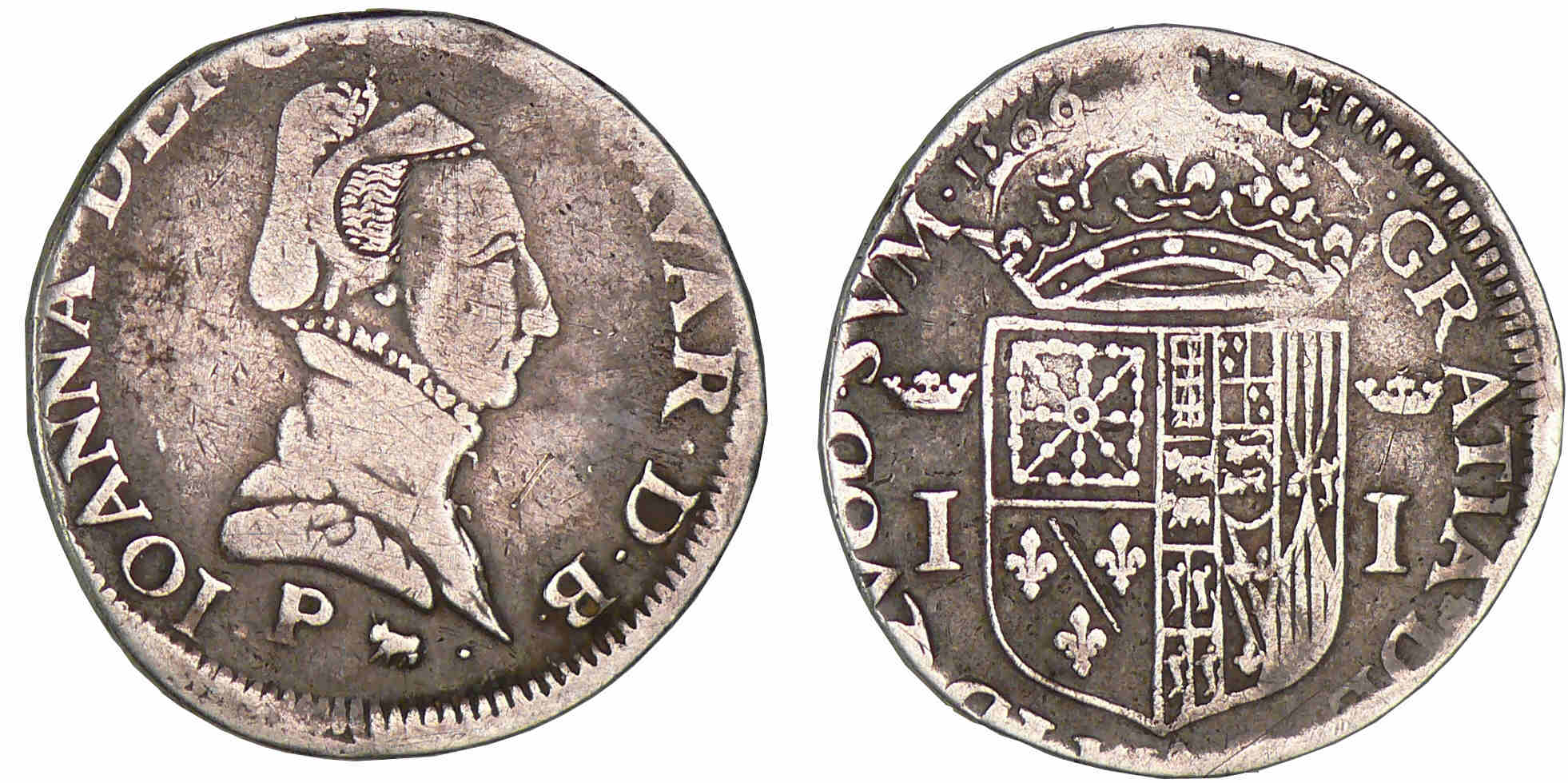 Avers : Jeanne d’Albret (1562-1572). A/ .IOANNA. DEI. G. REG. NAVARE. D. B. Buste habillé à droite de Jeanne d’Albret. Au-dessous, un P et une vache.