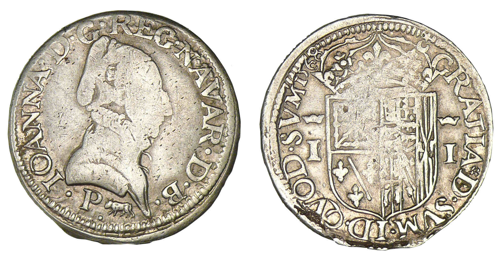 Avers : Jeanne d’Albret (1562-1572). A/ .IOANNA. D. G. REG. NAVAR. D. B. Buste habillé à droite de Jeanne d’Albret. Au-dessous, un P et une vache.