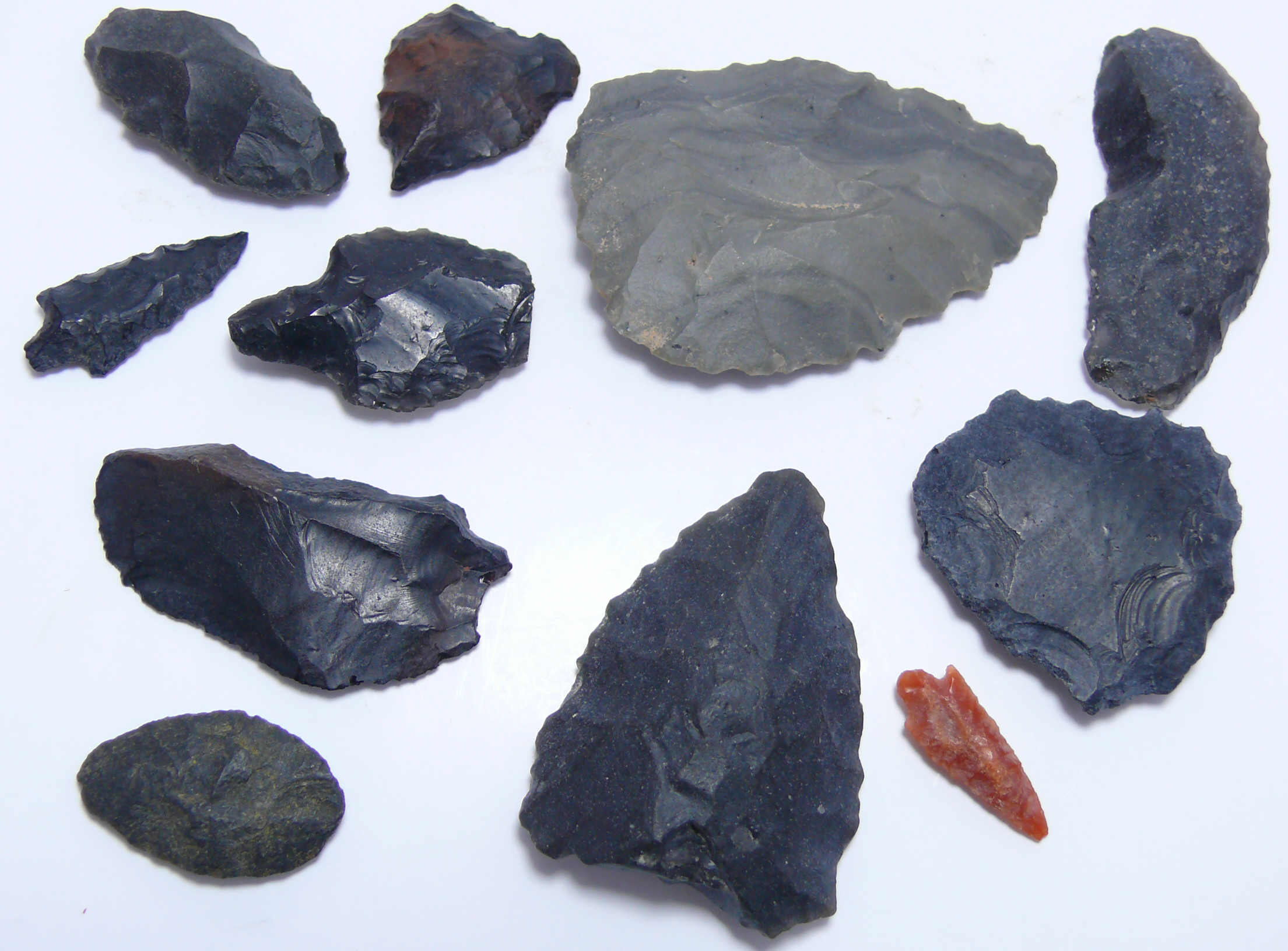 Avers : Bel ensemble d’objets taillés : pointes, grattoires en obsidienne, lave, quartz, jaspe. Dimensions : de 45 à 15 mm. Ex collection Pierre Pourrut (1937-2014).