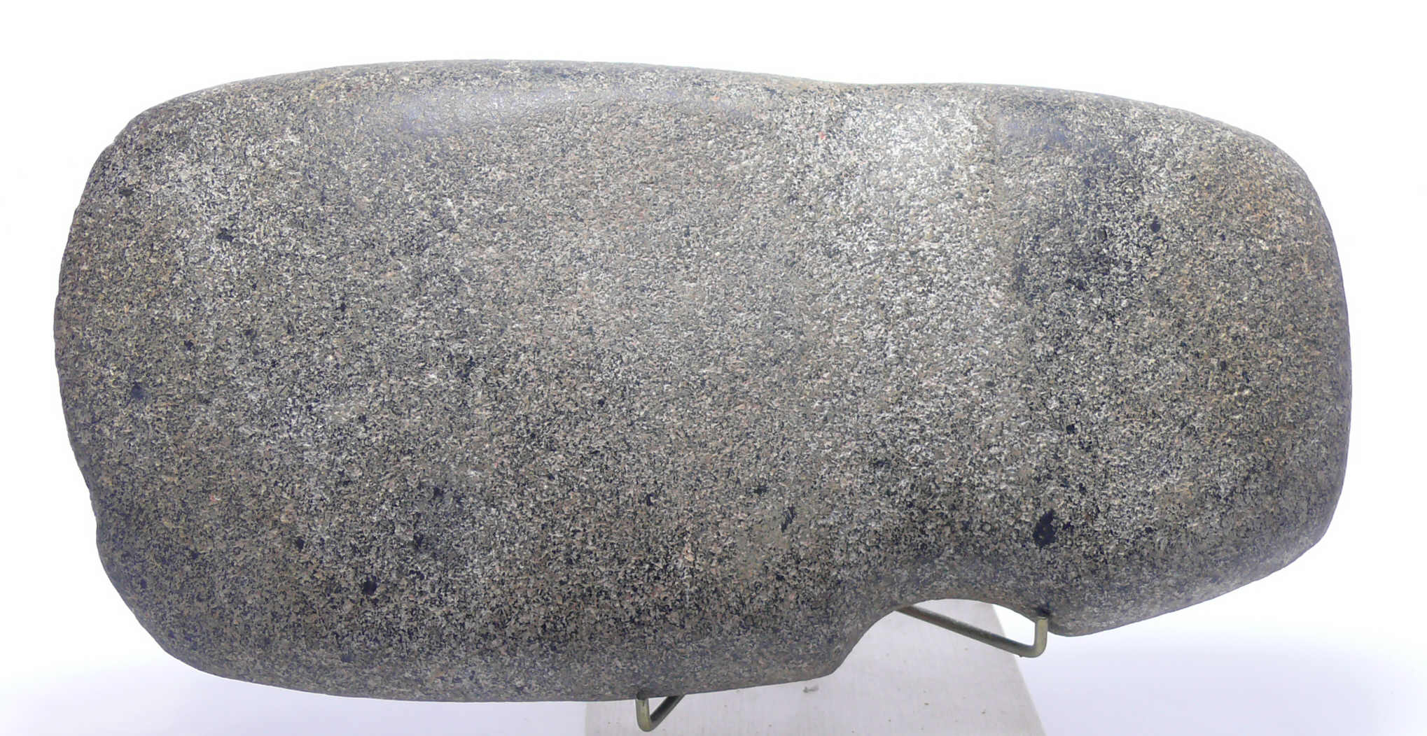 Avers : Magnifique hâche à gorge de fixation en trachyte dure (roche volcanique). Très belle patine. Dim : 200*95*45 mm. Ex collection Pierre Pourrut (1937-2014).