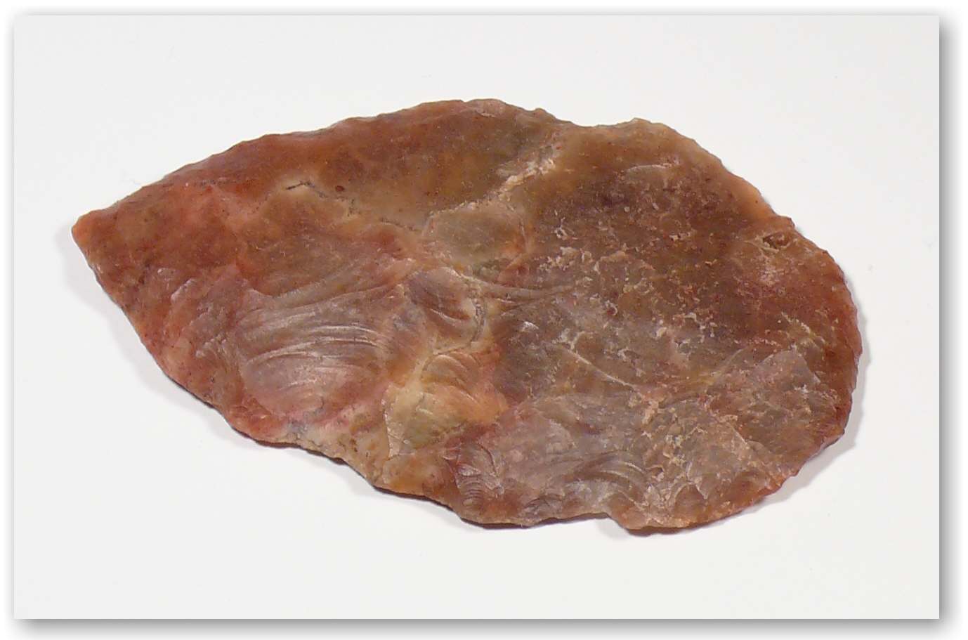 Avers : Très intéressante et jolie pointe en jaspe en forme de feuille de laurier – Enlèvements des tranchants très fins – 72×43 mm.