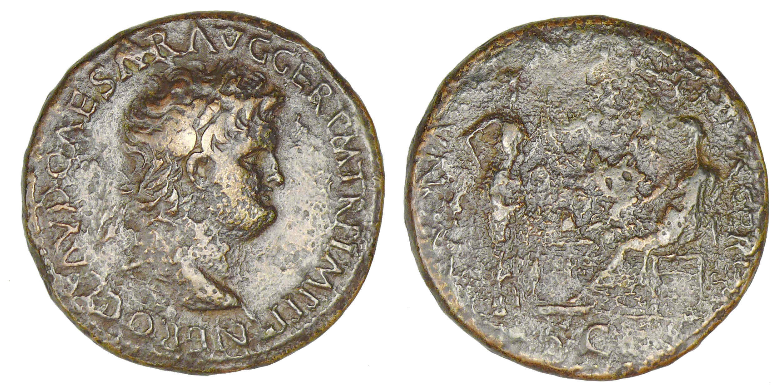 Avers : A/ NERO CLAVD CAESAR AVG GER P M TR P IMP P P. Tête laurée à droite.