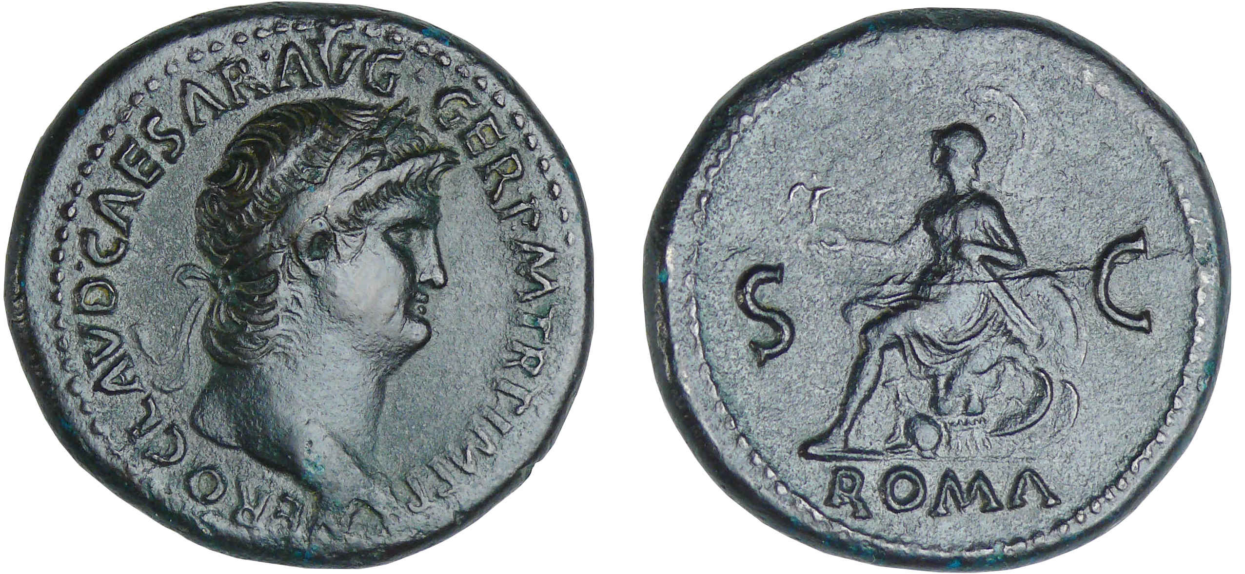 Revers : R/ S C // ROMA. Rome assise à gauche, tenant une Victoire et un parazonium ; le pied posé sur un casque.