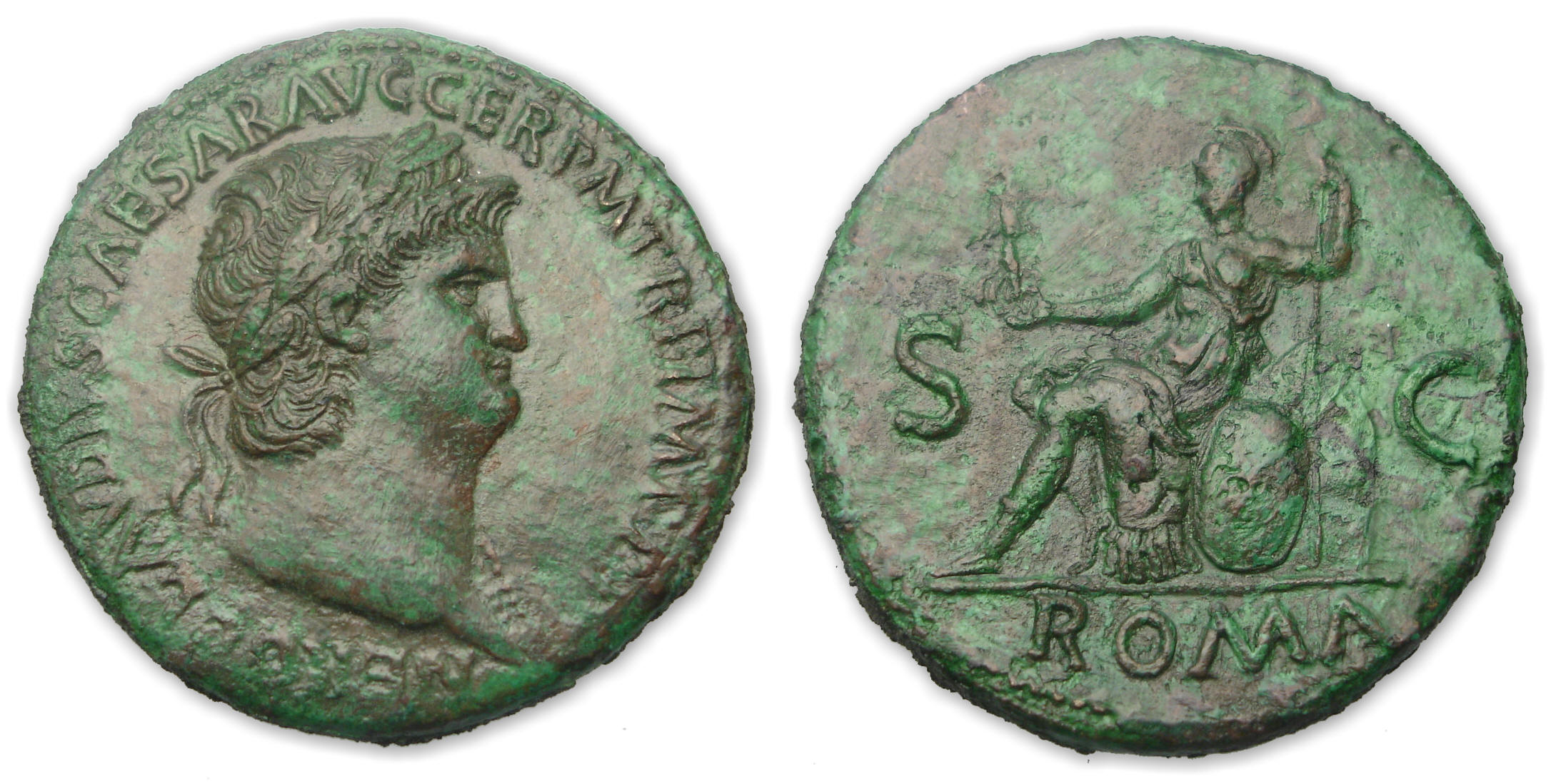 Avers : A/ NERO CLAVD CASEAR GER P M TR P IMP P P P Tête de Néron à droite.