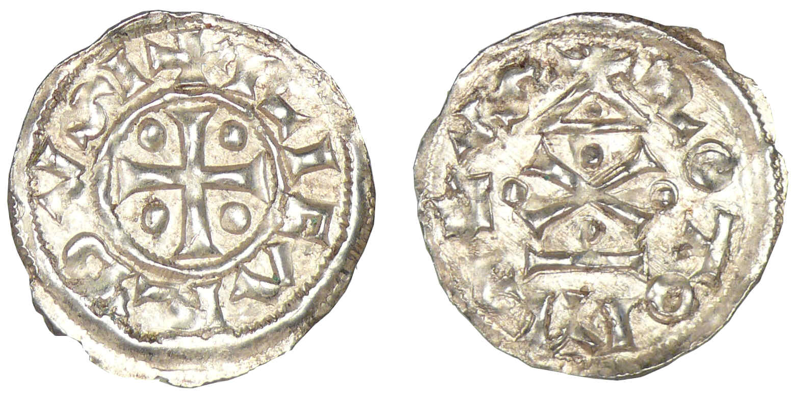 Revers : R/ ROTOMAGVS. Temple composé d’un fronton pointé, sommé d’une croisette coupant la légende en haut, portant un sautoir en cœur et cantonné de quatre besants. Le tout, posé sur un trait. Variété au besant dans le fronton.