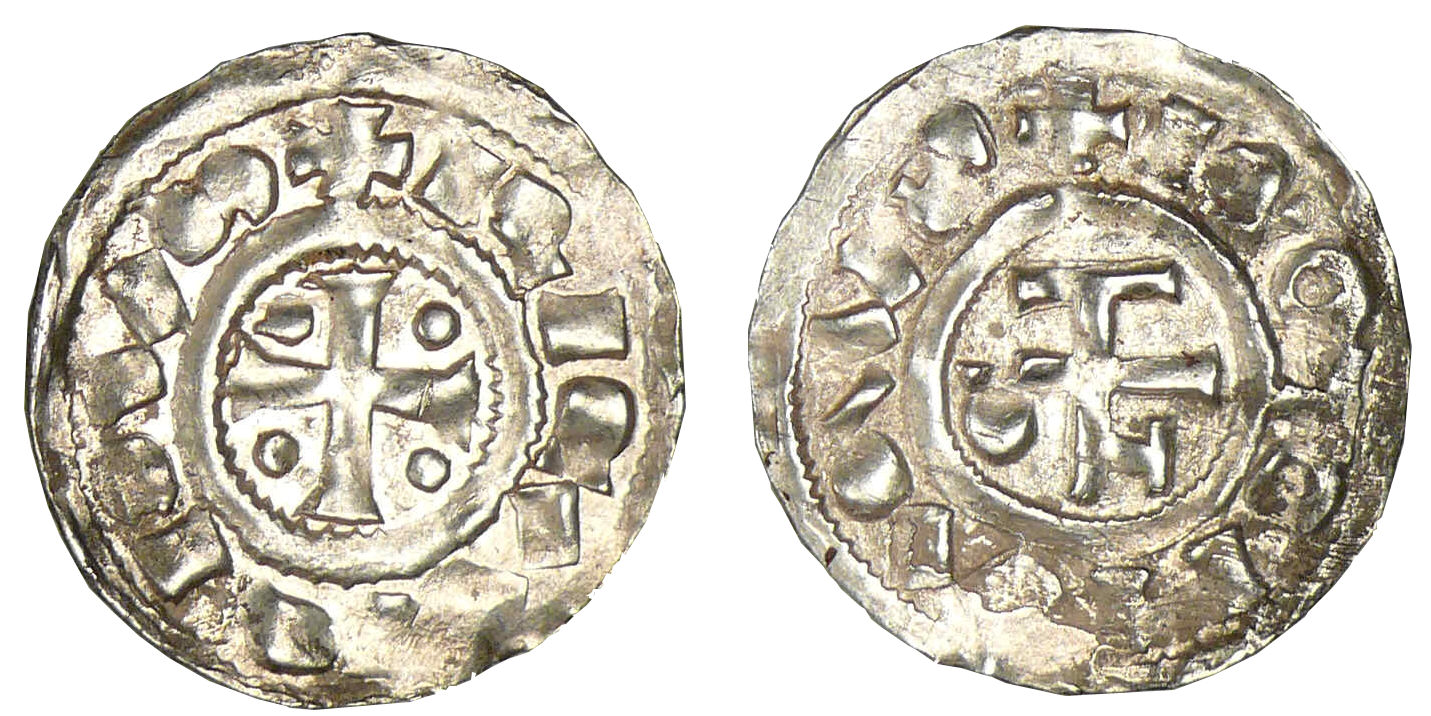 Hugues, archevêque de Rouen (943-996). A/ RICARDVS. Croix cantonnée de quatre besants.