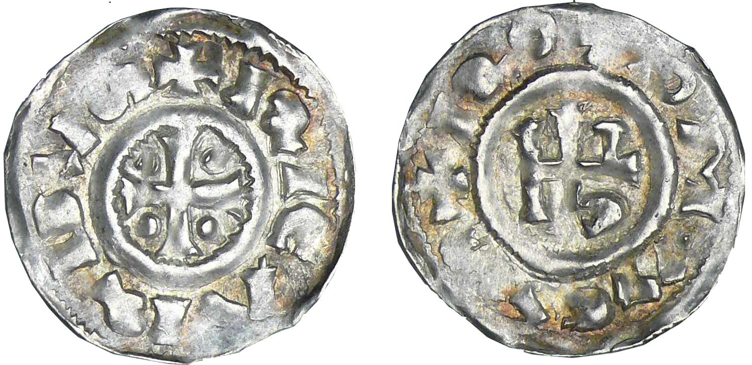 Hugues, archevêque de Rouen (943-996). A/ RICARDVS. Croix cantonnée de quatre besants.