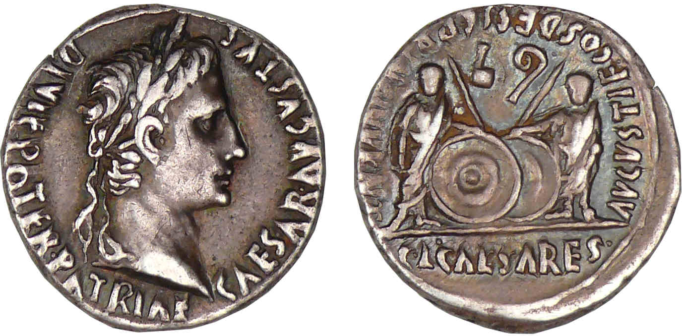Revers : R/ C L CAESARES AVGVSTI F COS DESIG PRINC IVVENT. Caïus et Lucius debout, tenant chacun une haste et un bouclier. Dans le champ, un simpule et le bâton d’augure.