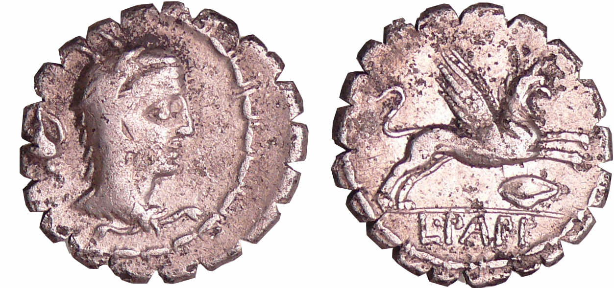 A/ Anépigraphe. Tête de Junon Sospita à droite, coiffée de la dépouille de chèvre. Derrière, un lituus.