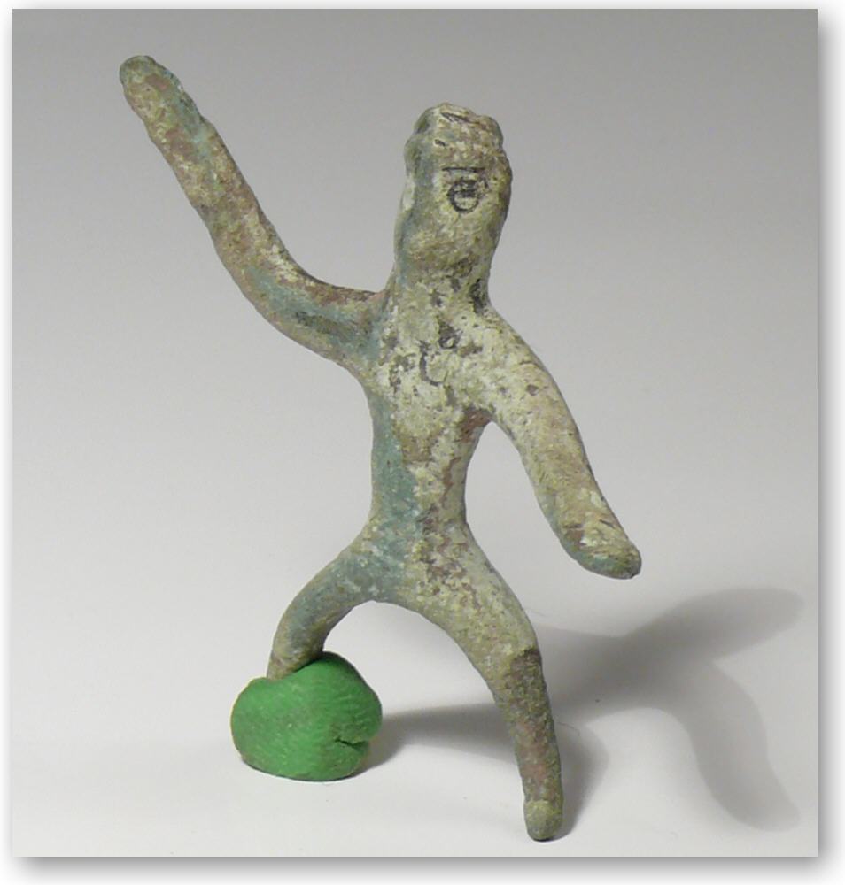 Avers : Petit cavalier filiforme en bronze recouvert d’une patine vert clair – 39×38 mm.