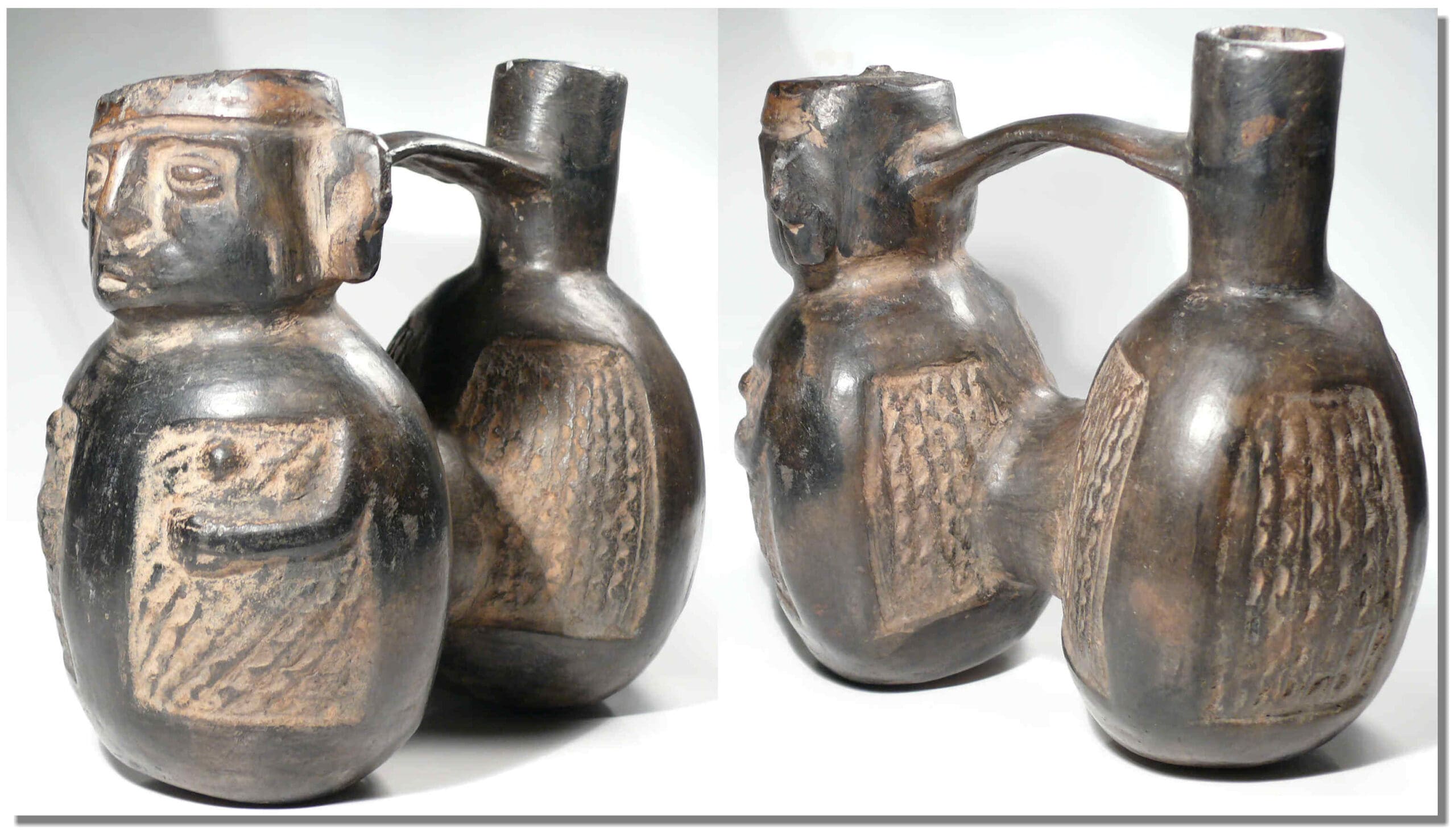 Important vase antropomorphe à deux panses et anse centrale, en terre cuite noire – Petit manque sur l’oreille du personnage. Objet exceptionnel, joliment décoré – 160x180x120 mm.