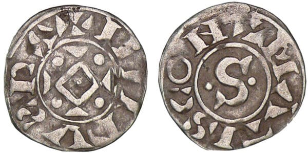 Avers : A/ + PIIIPVS RX. Croix avec losange évidé en cœur, cantonnée de quatre globules.