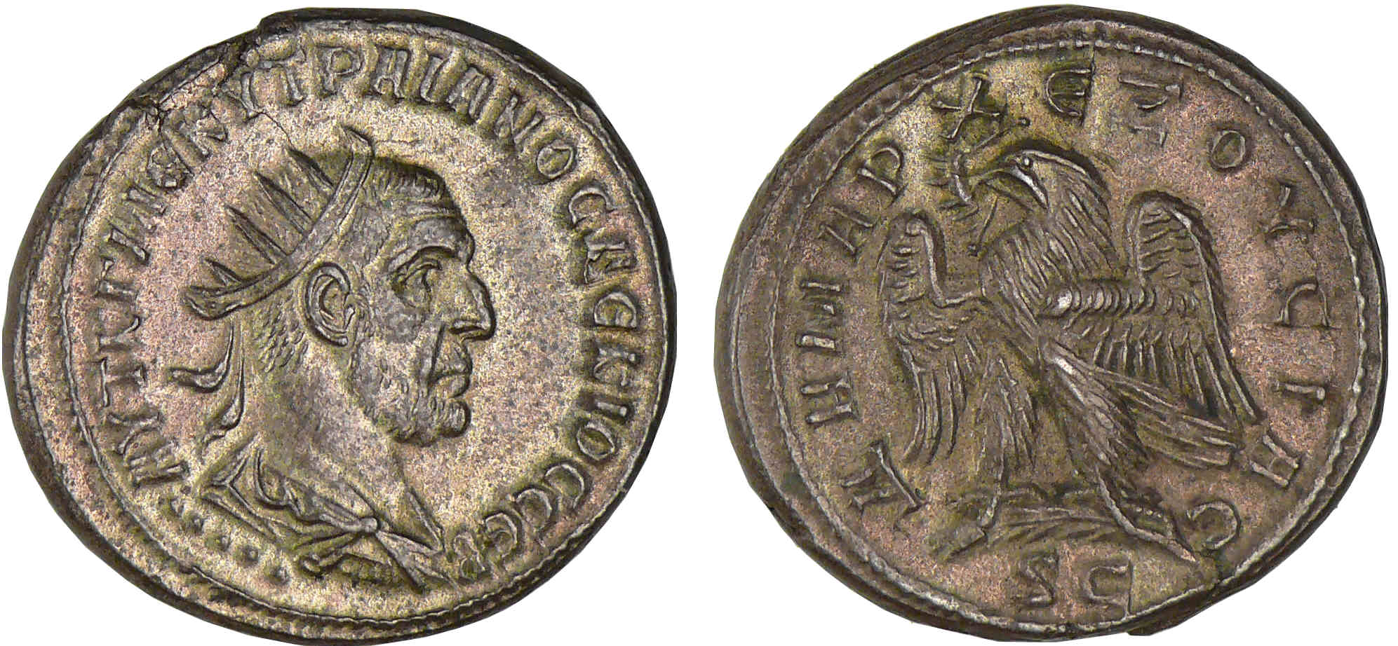 R/ ΔΗΜΑΡΧ ЄΞΟΥCΙC. Aigle debout de face, tourné à droite, les ailes déployées et tenant une couronne dans son bec.