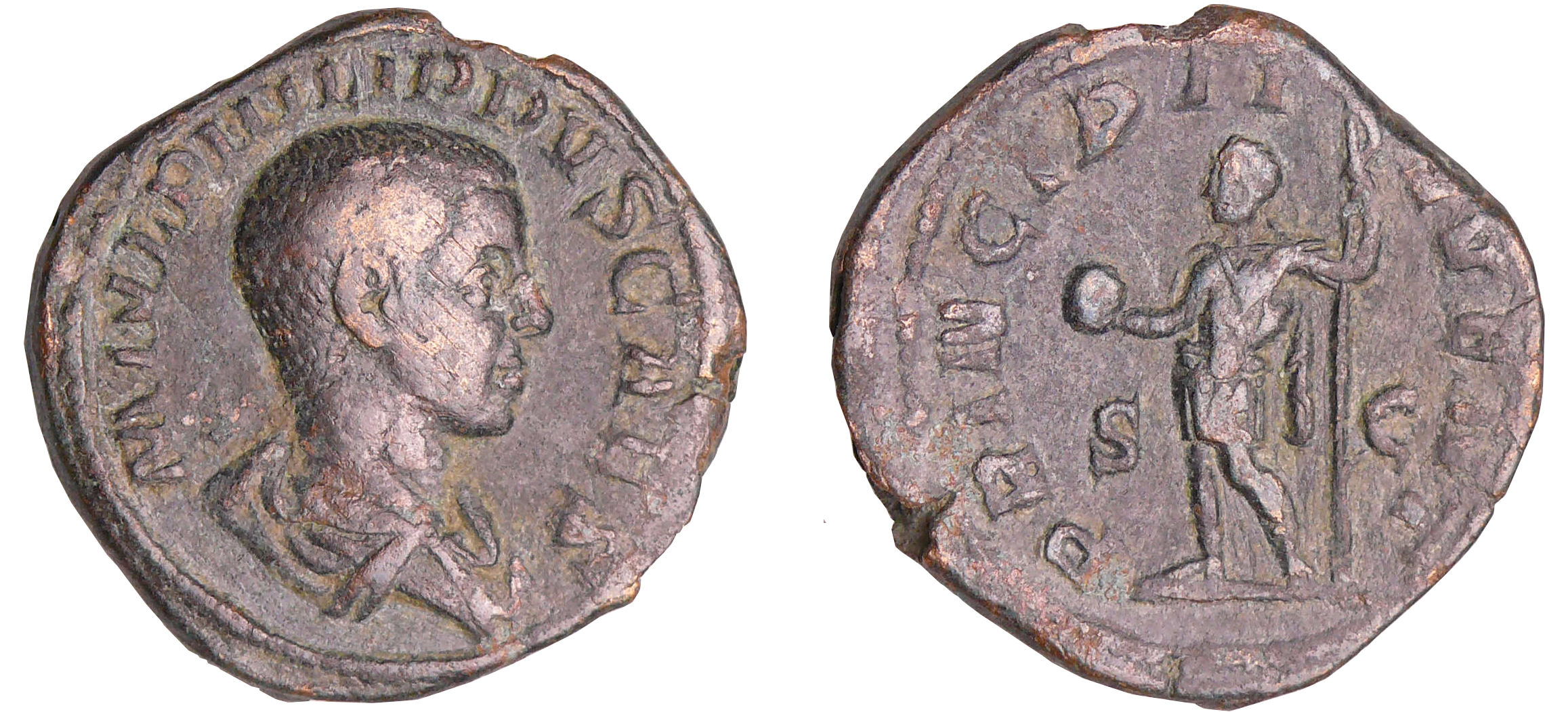 Revers : R/ PRINCIPI IVVENT // SC dans le champ. Philippe en habits militaires, debout à gauche, tenant une haste et un globe.
