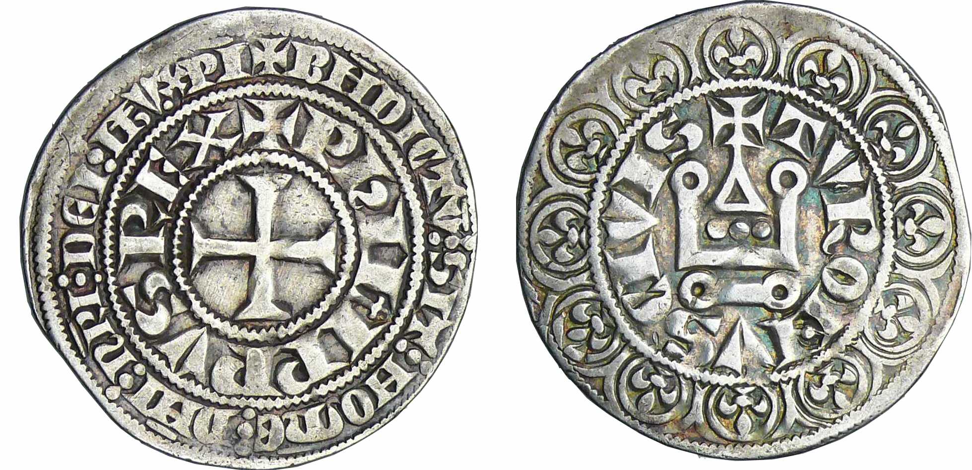 Avers : A/ + BNDICTV:SIT: NOmE: DNI: nRI: DEI: IhV. XPI intérieur : PhILIPPVS REX. Croix L avec un trident.