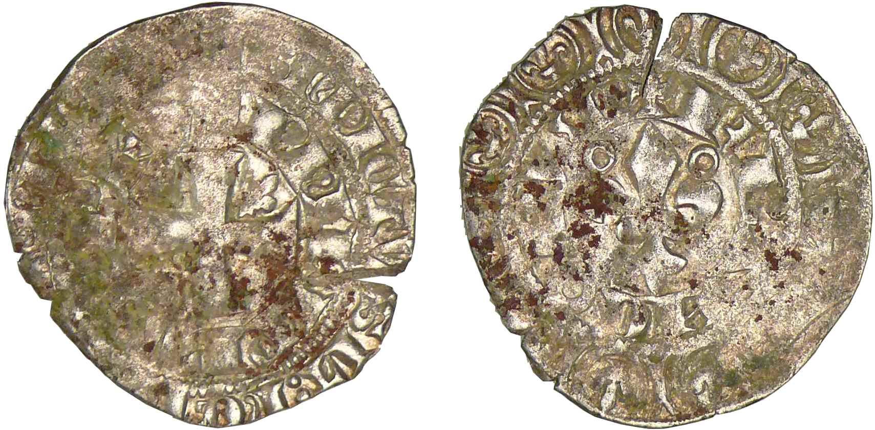 A/ PhILIPPVS REX, légende extérieure : + BnDICTV: SIT: nOmE: DnI: nRI: D. Croix pattée cantonnée d’un lis au 2ème canton.