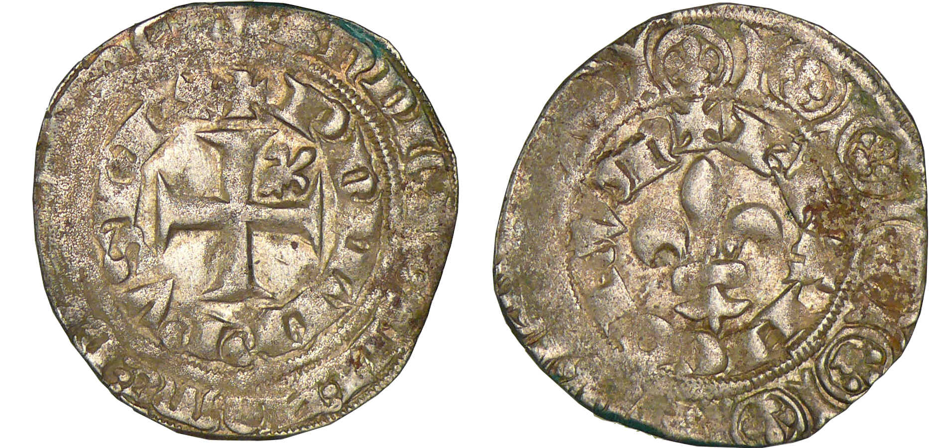 A/ PhILIPPVS REX, légende extérieure : + BnDICTV: SIT: nOmE: DnI: nRI: D. Croix pattée cantonnée d’un lis au 2ème canton.