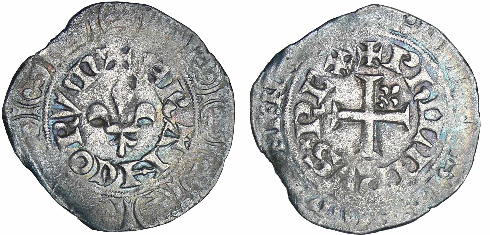 A/ PhILIPPVS REX, légende extérieure : + BnDICTV: SIT: nOmE: DnI: nRI: D. Croix pattée cantonnée au 2ème canton d’un lis.