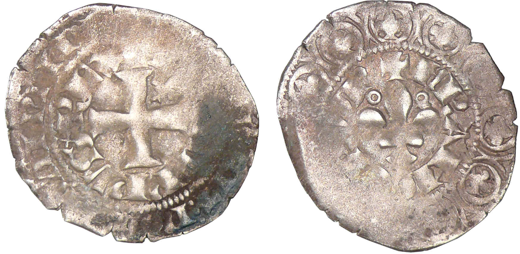 A/ PhILIPPVS REX, légende extérieure : + BnDICTV: SIT: nOmE: DnI: nRI: D. Croix pattée cantonnée d’un lis au 2ème canton.