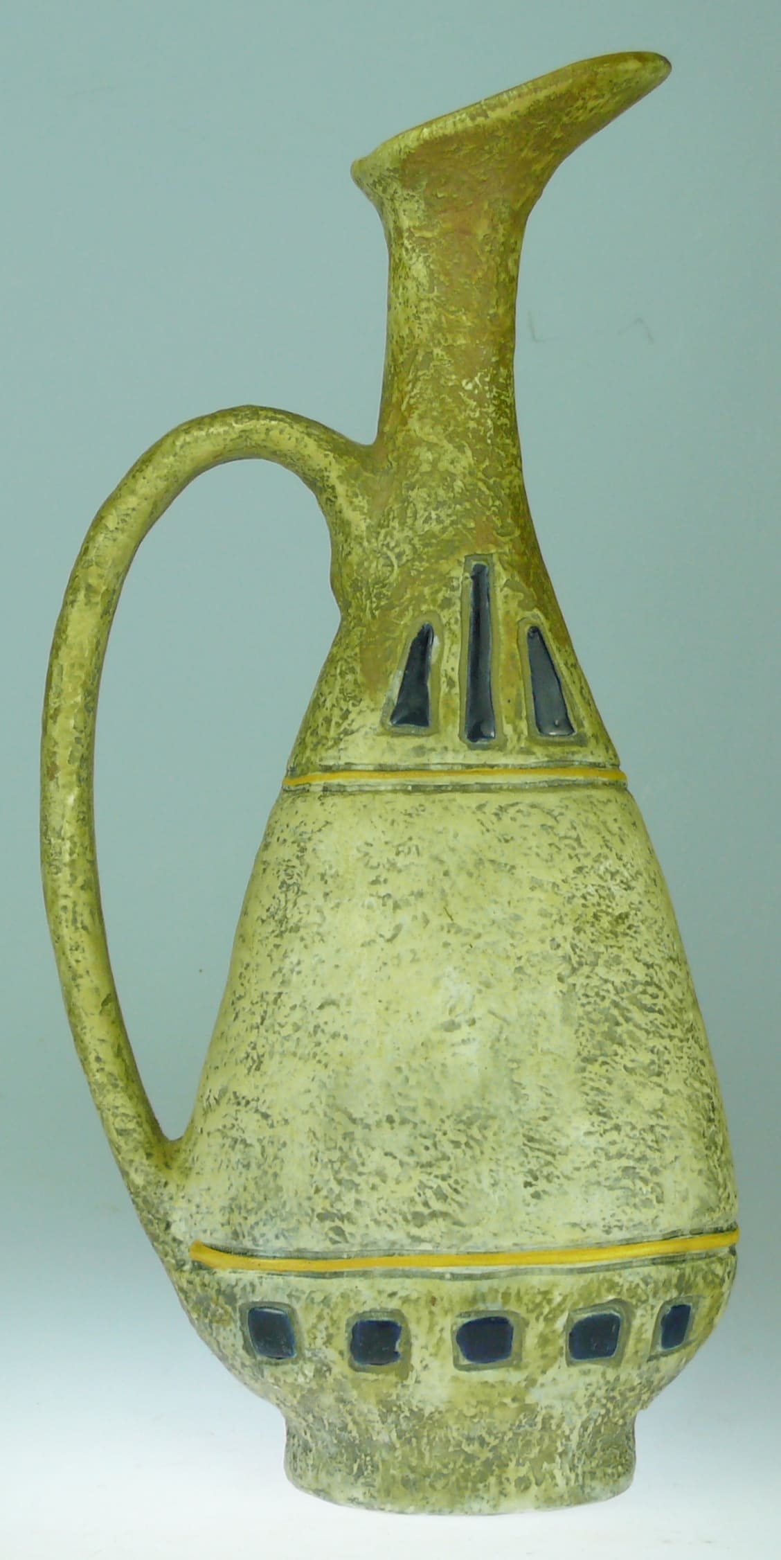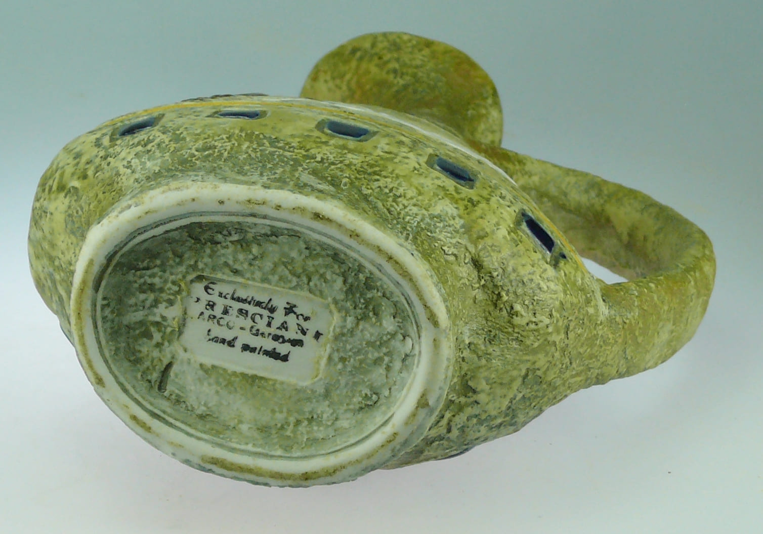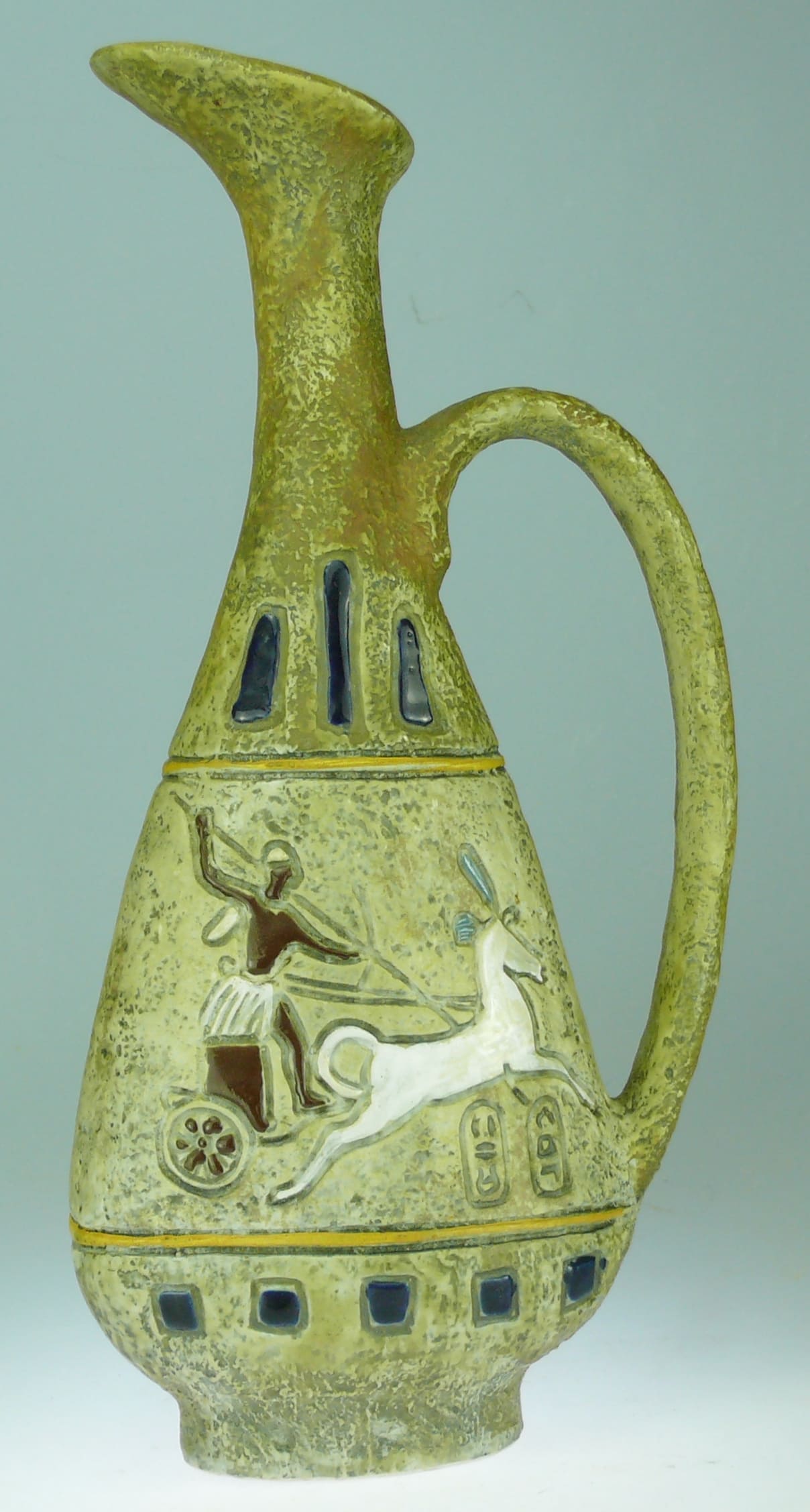 Avers : Pichet en céramique à grande anse et large bec verseur, à décor émaillé représentant un guerrier vêtu d’un pagne blanc, debout dans un char tiré par un cheval blanc décoré d’un plumet bleu. La bouteille est estampillée en dessous : Exclusivity for BRESCIANI ARCO Gardasao hand painted. Manque le bouchon. 30 cm
