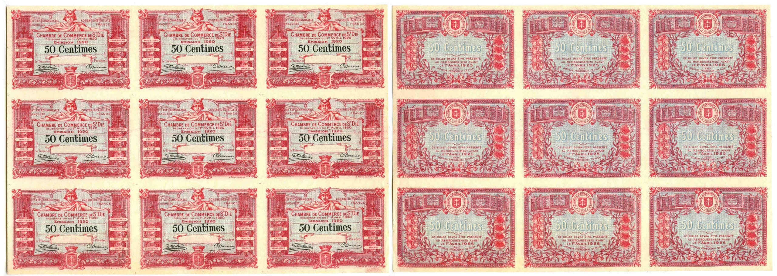 Planche de 9 billets de nécessité – 50 centimes de Saint Dié émission 1920