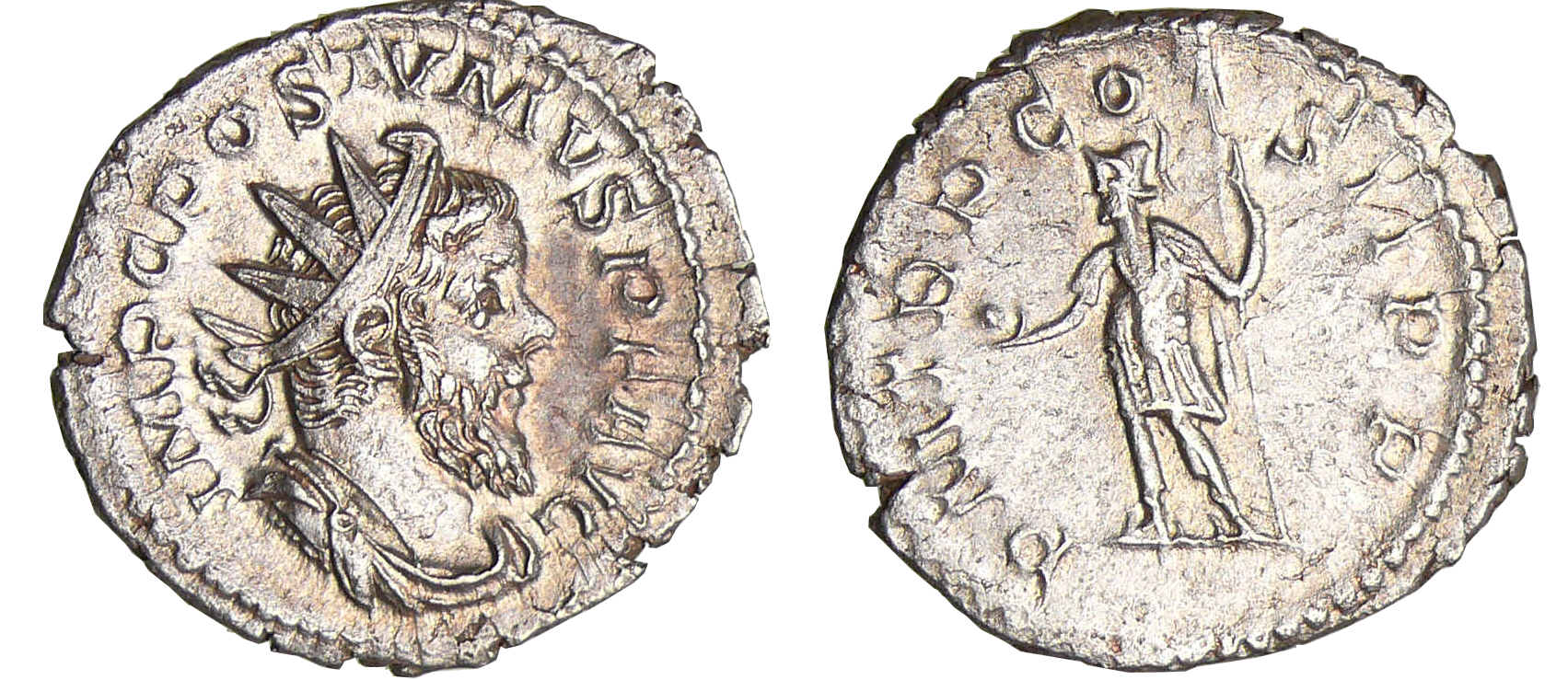 R/ P M TR P COS II P P. Postume debout à gauche, tenant un globe et une haste.