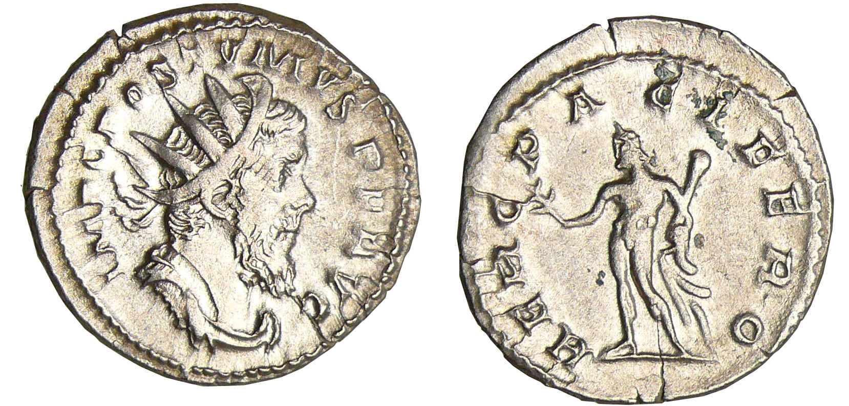 R/ HERC PACIFERO. Hercule nu, debout à gauche, tenant une branche d’olivier et une massue avec la peau de lion.