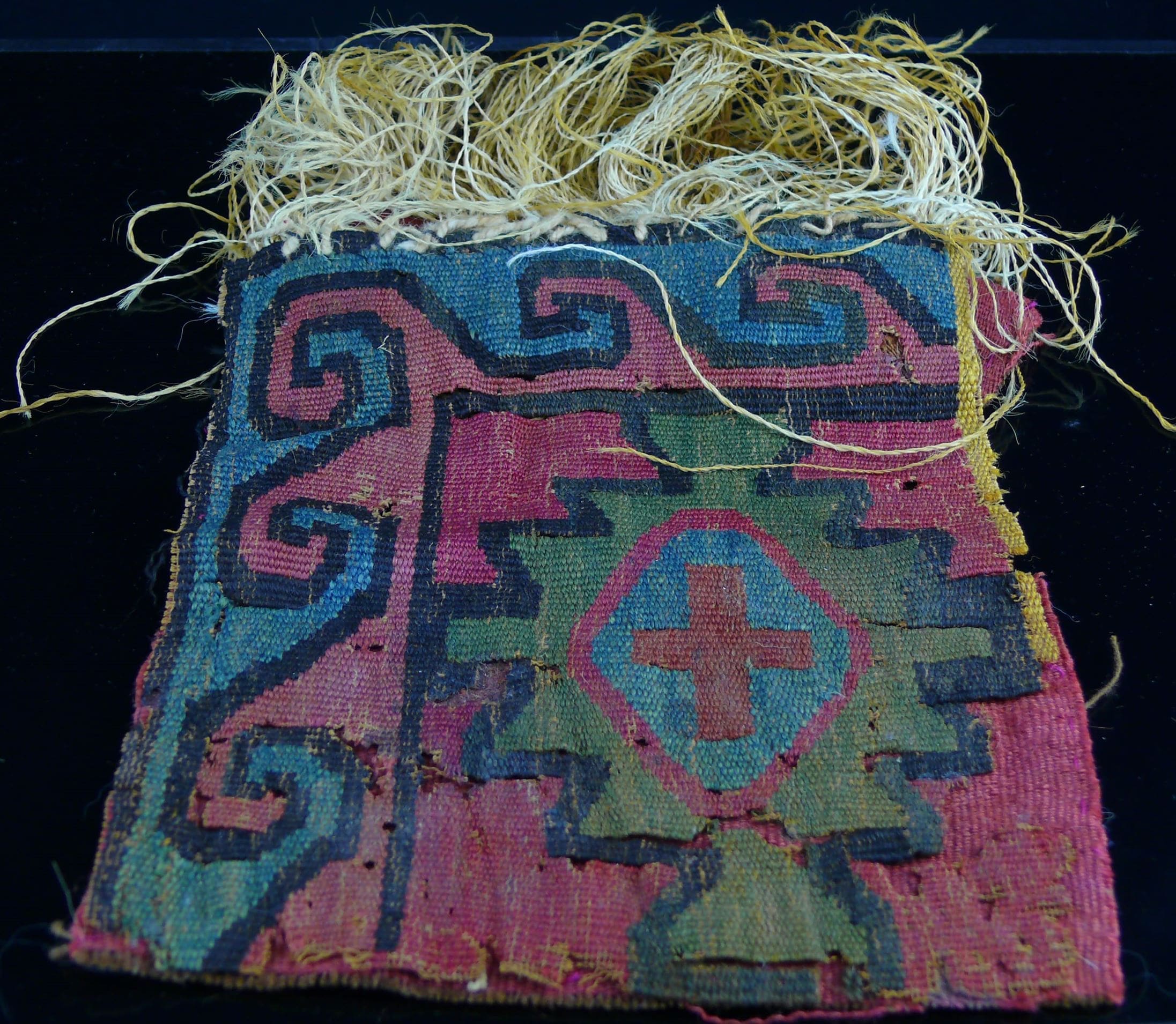 Avers : Pochette en tissu ou chuspas, fabriqué en tissu rouge orné d’une frise à décor géométrique de couleur verte et d’une longue frange de fils. Ces pochettes sont utilisées pour le transport des feuilles de coca et sont fabriquées dans des tissus très colorés tissés à partir des poils d’alpagas et de lamas. A noter une usure d’usage sur l’ensemble de la pochette. Dimensions : 155*185 mm