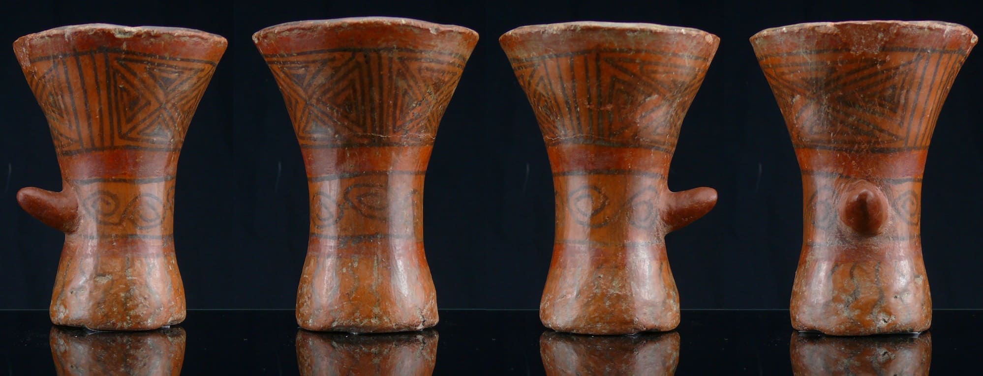 Rare verre de cérémonie à représentation phallique à engobe marron, ornée de frises aux motifs géométriques peints en noir à l’intérieur et à l’extérieur de l’objet. Dimensions : 126*96*96 mm.