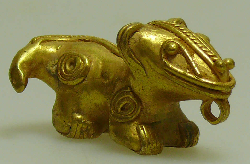 Jaguar orné de volutes sur le corps. Tumbaga (alliage d’or, d’argent et de cuivre). Poids : 21.87 gr ; Dimensions : 42×23 mm.