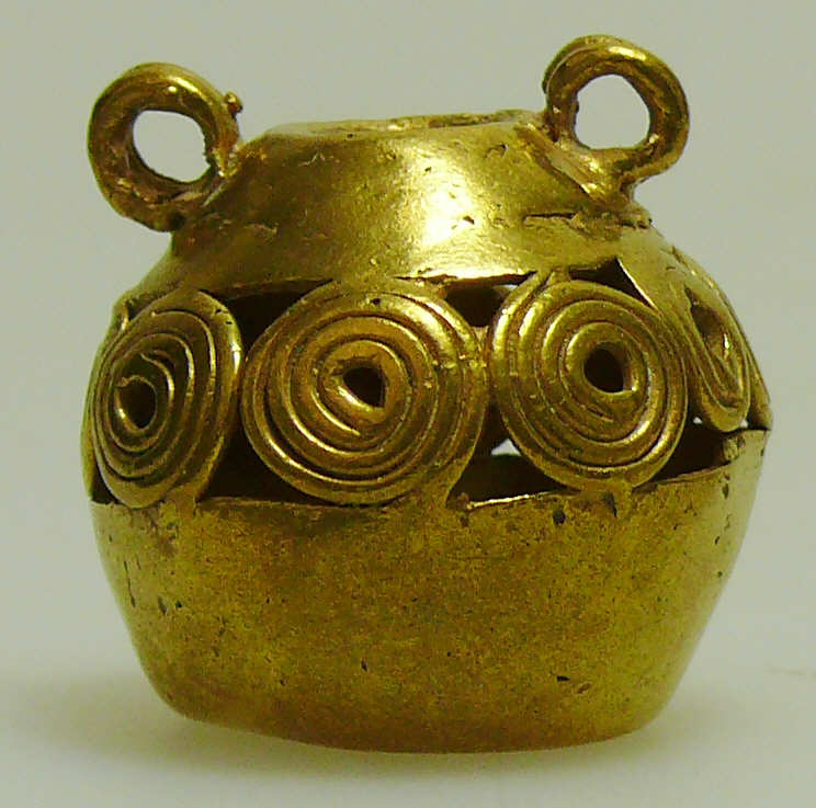 Jarre à offrandes décorée de volutes en tumbaga (alliage d’or, d’argent et de cuivre). Poids : 10.76 gr ; Dimensions : 24×24 mm.