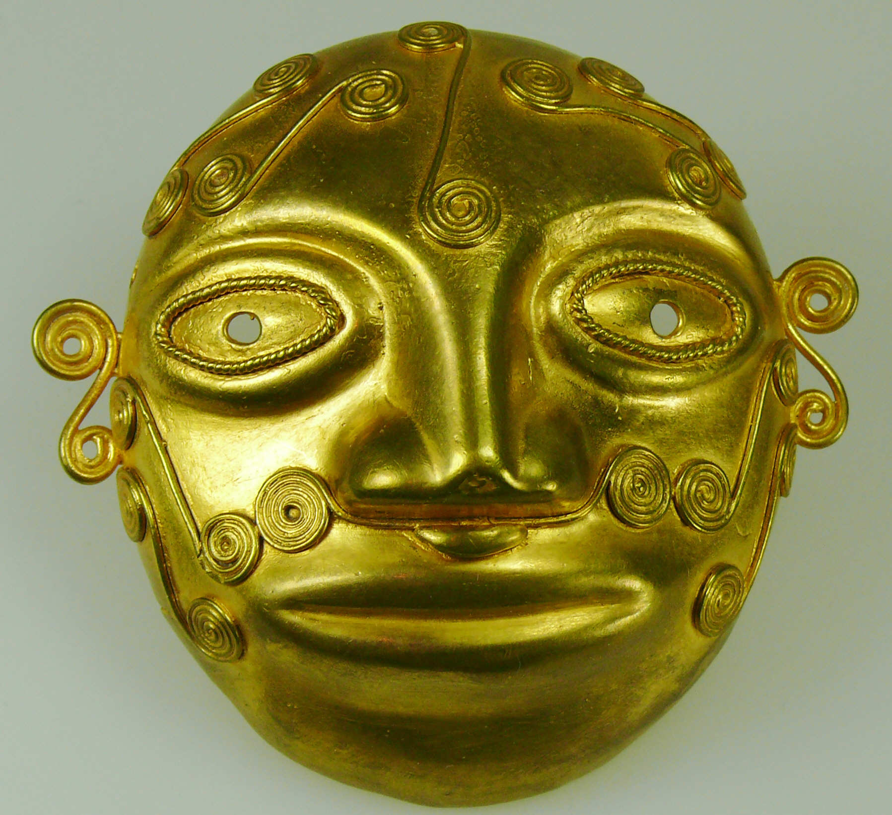 Avers : Important masque de guerrier couvert de scarifications en forme de double spirale. Tumbaga (alliage d’or, d’argent et de cuivre). Poids 42.14 gr : ; Dimensions : 76×72 mm.