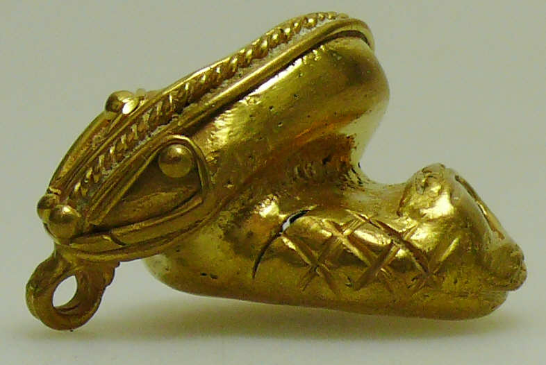 Serpent en forme de pendentif. Tumbaga (alliage d’or, d’argent et de cuivre). Poids : 14.27 gr ; Dimensions : 35×25 mm.