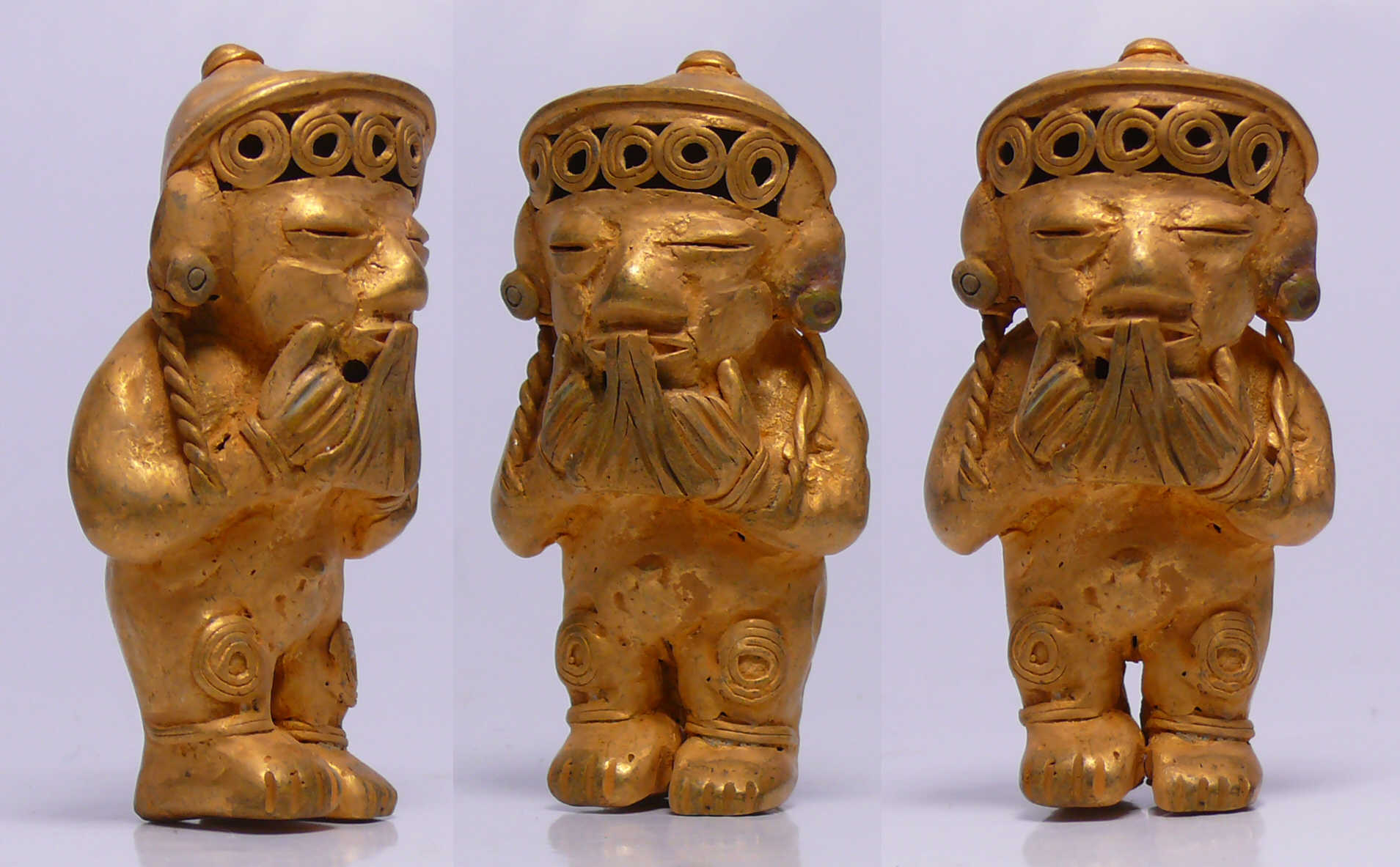 Chaman debout, jouant d’un instrument.Le personnage porte une jolie coiffe ornée d’osselles et des boucles d’oreilles. Objet en Tumbaga (alliage d’or, d’argent et de cuivre). Poids : 41.04 gr ; Dimensions : 72×38 mm.