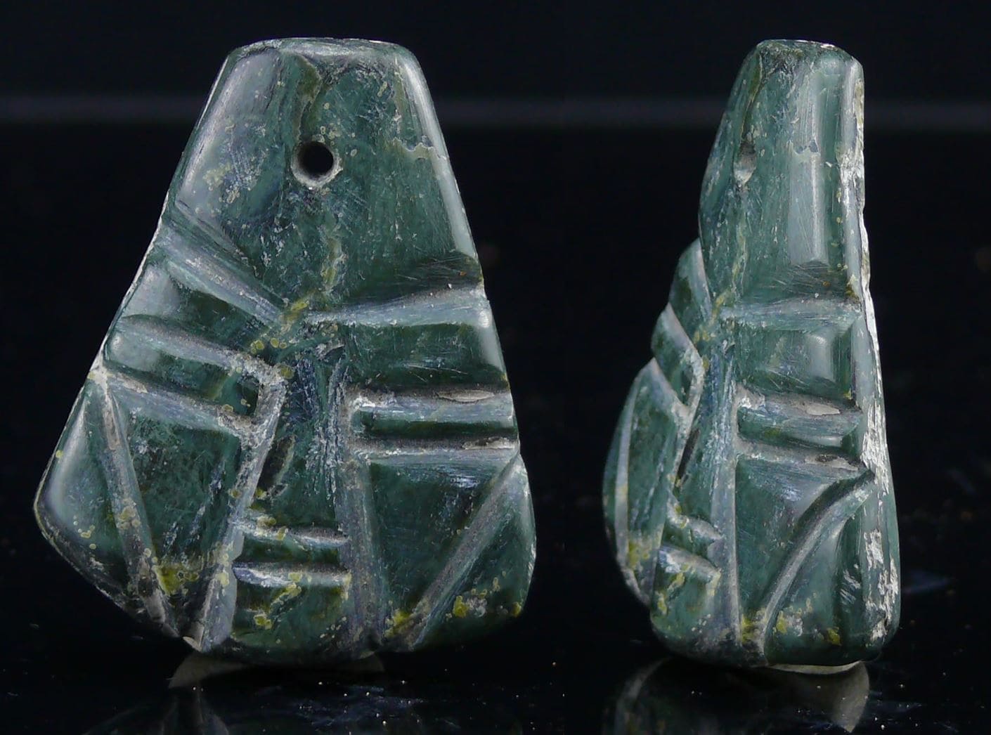 Pendentif en jade de forme pyramidale, représentant un visage stylisé35*43 mm