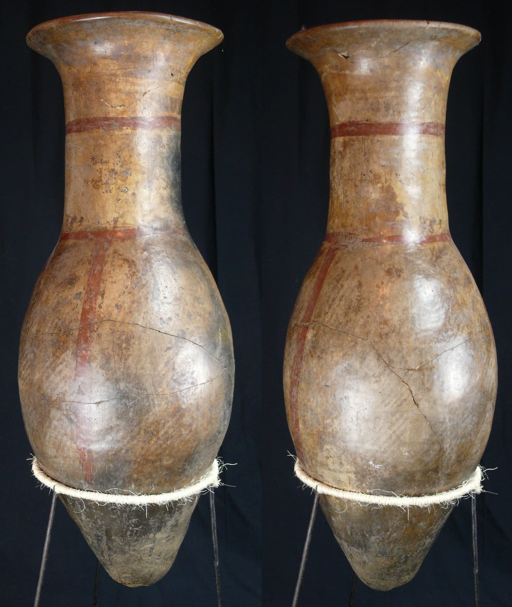 Avers : Très rare objet de la culture précolombienne. Très grande urne ou vase de forme amphorique en terre cuite de couleur brune, ornée de panneaux de formes géométriques représentant des lignes et des chevrons. Le col est décoré de 2 frises ocres et d’annelets peints en rouge. Ancienne collection Pierre Pourrut (1937-2014). Recollages et petits éclats. Cet objet est à prendre en nos bureaux. This item must be withdrawn in our offices. Dimensions : 750*300*300 mm.