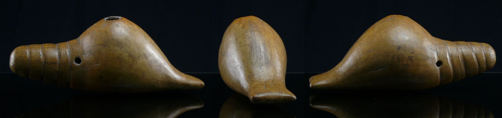 Ocarina en forme de coquillage, recouverte d’une engobe beige, ornée de stries à une extrémité. Dimensions : 180*70*63 mm.