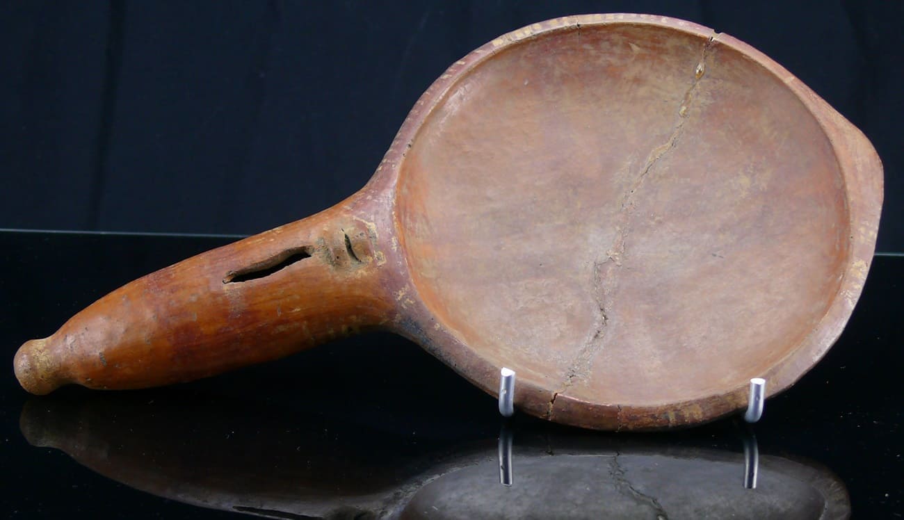 Avers : Rare encenseur de couleur brune comportant une poignée creuse stylisée avec une bille à l’intérieur, probablement agité pendant les cérémonies rituelles. Ancienne collection de Frentz, Münich 1960. Recollage au centre de l’objet. Dimensions : 260*150*35 mm.