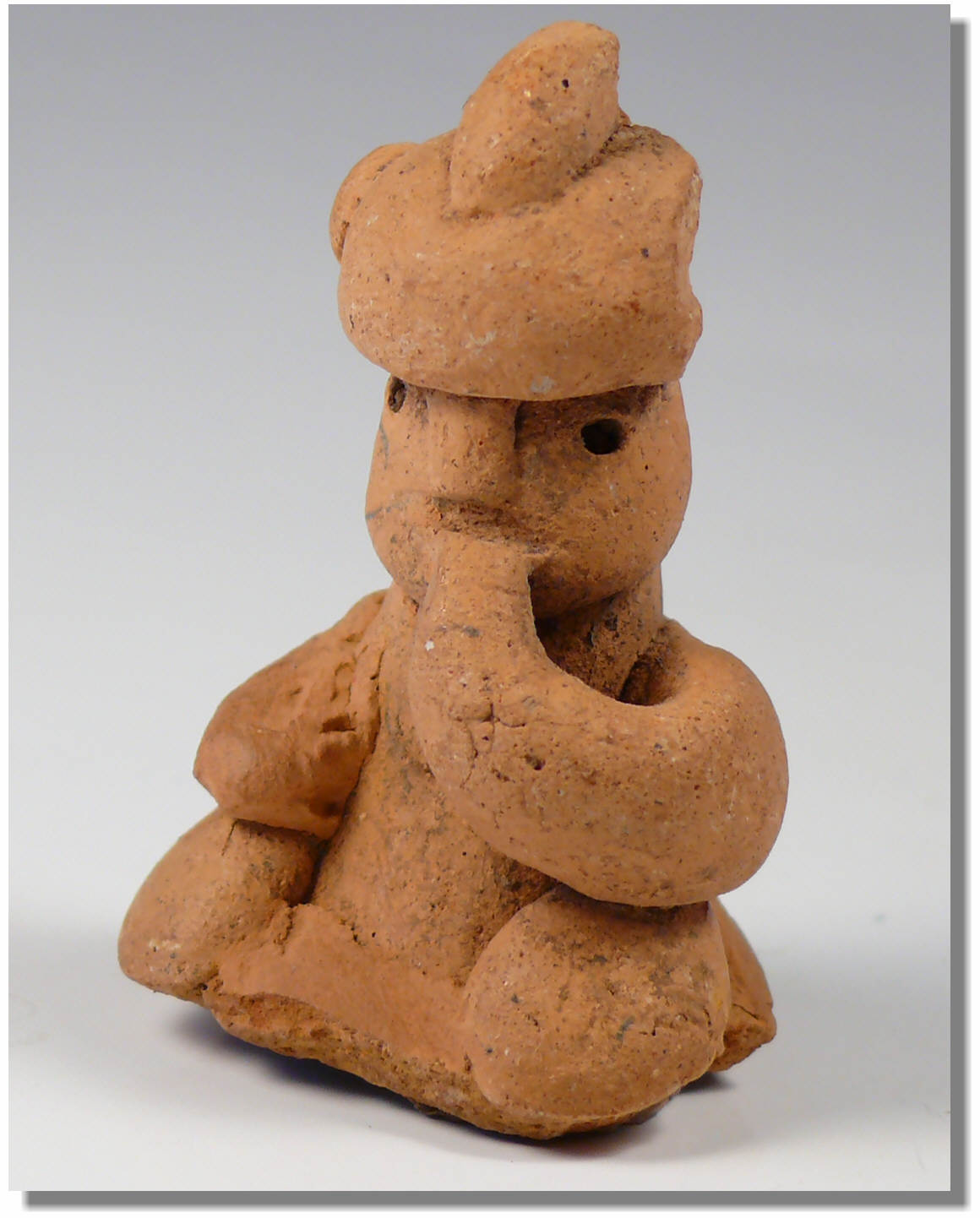 Statuette représentant un homme assis, portant la main à la bouche – Le personnage est coiffé du chapeau rituel – 50×30 mm.