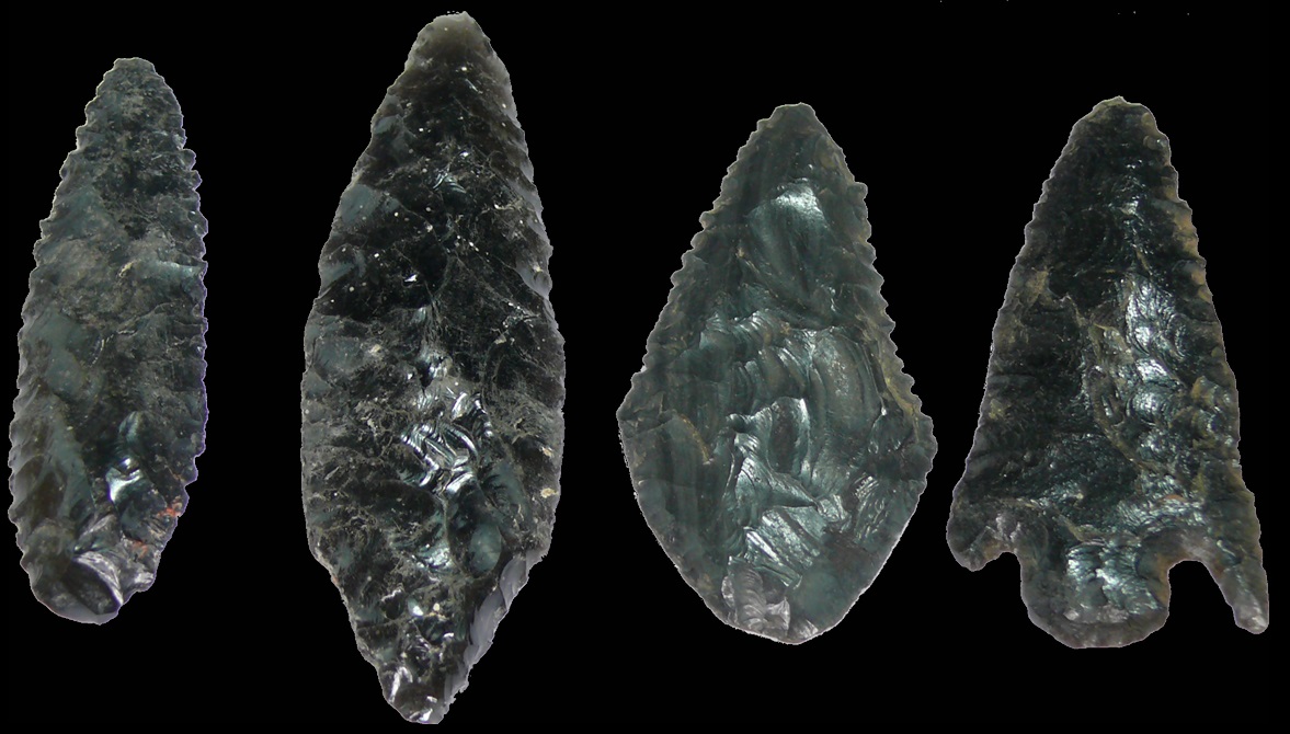 4 importantes pointes de flèche en obsidienne. Dimensions : 60 à 80 mm.