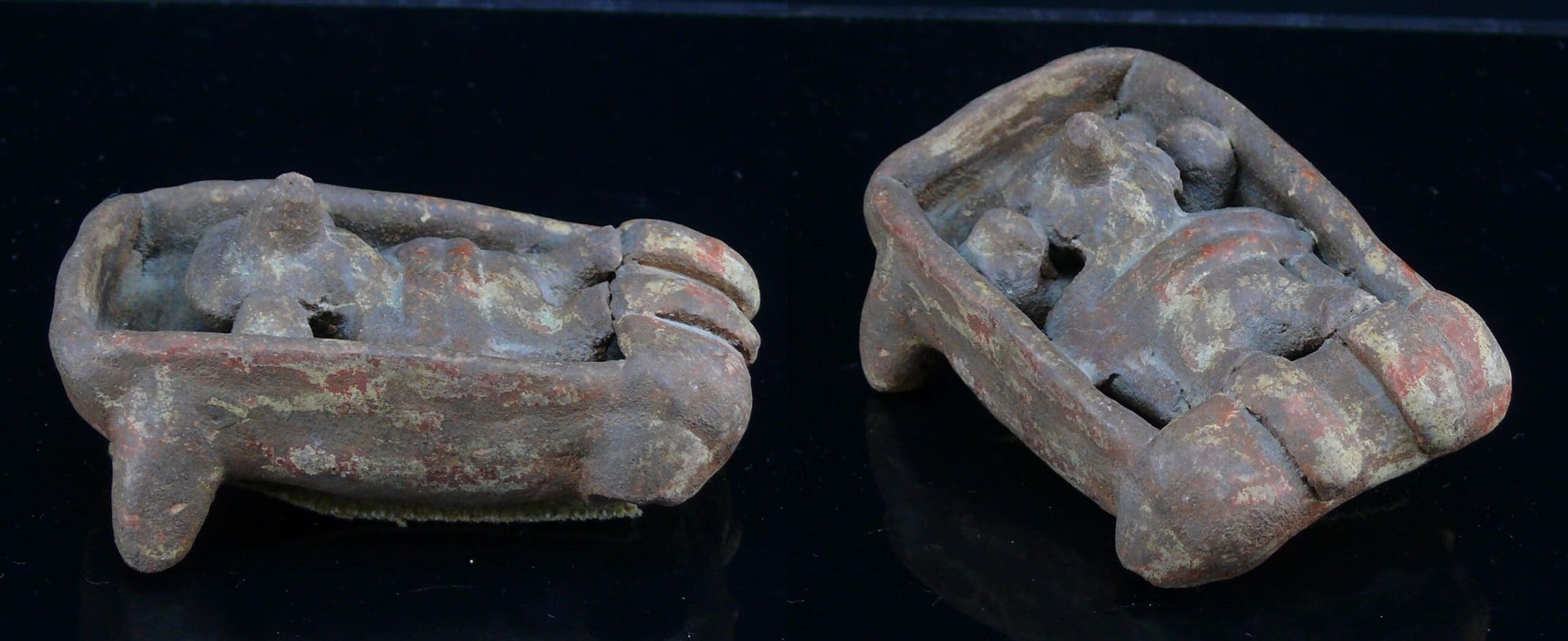 Avers : Lit mortuaire en terre cuite rouge servant au rituel funéraire et à l’hommage au défunt avant son passage dans l’au-delà. Le défunt est petit, peut-être un enfant. Il est allongé sur le lit, le corps maintenu par des larges liens.Manque trois pieds du lit. A noter une fêlure sur chaque jambe. Dimensions : 60*100 mm