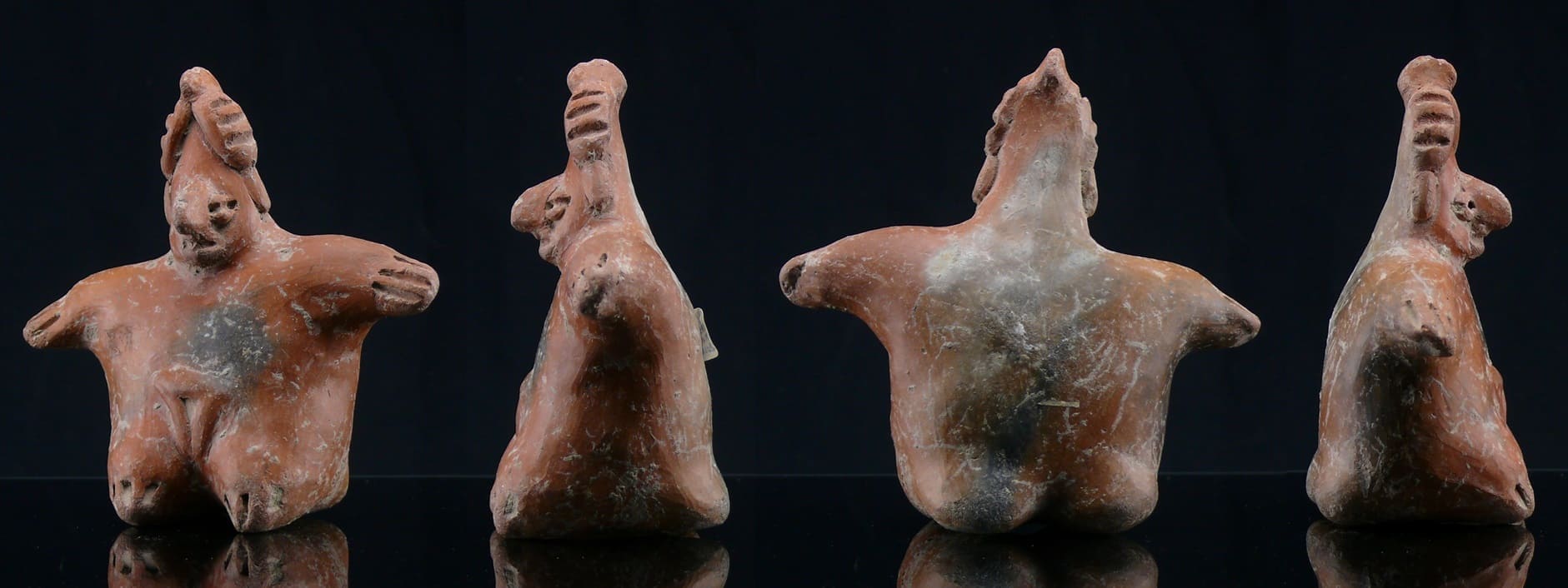 Statuette grelot à engobe rouge, représentant une grosse femme assise, une grande représentation du sexe entre les jambes. Le personnage a les bras écartés et porte une haute coiffe crantée. Dimensions : 120*57*116 mm.